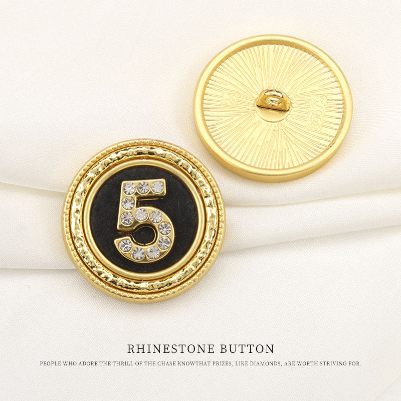 Кръгли златисти метални копчета с кристали и шарка с номер 5, 6 бр.