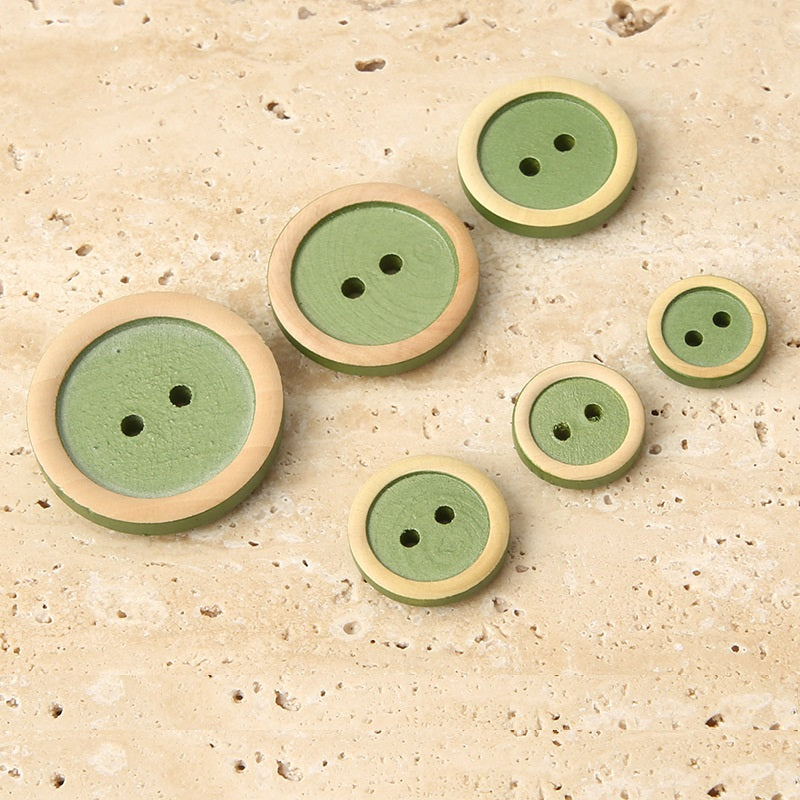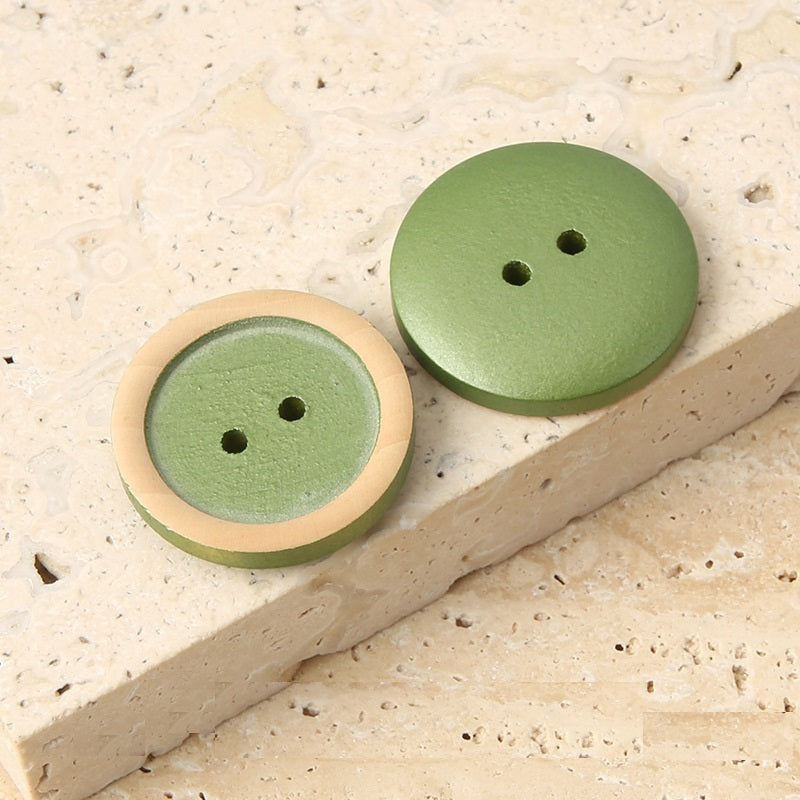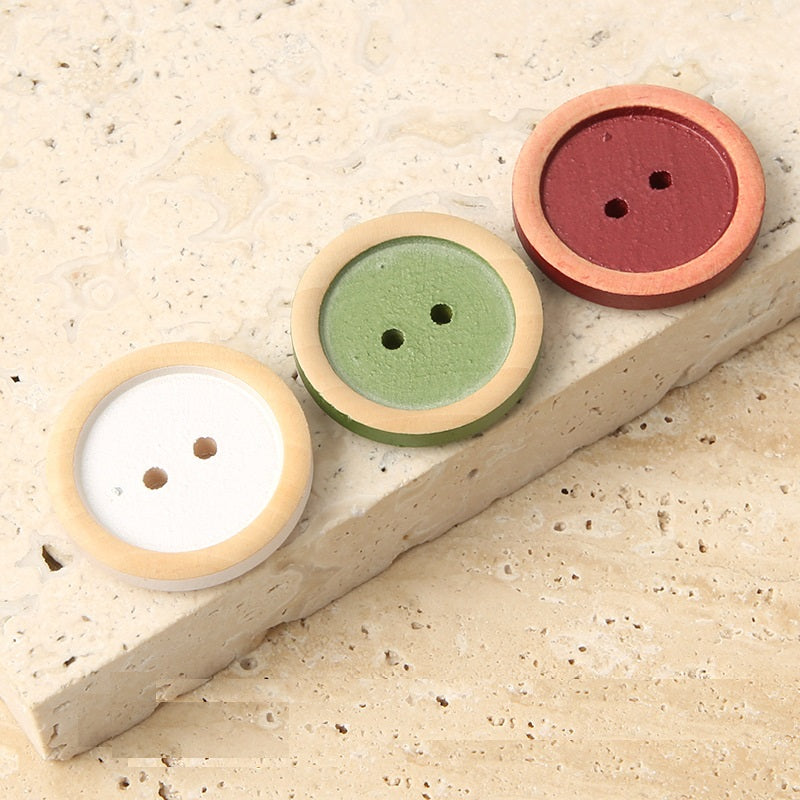 Тези кръгли копчета с диаметър 11 - 25 мм и два отвора са изработени от естествена дървесина и имат изтъркан завършек с бяла, зелена и червена боя. Комбинацията от цветове и остарелия вид създават уникална и очарователна естетика.