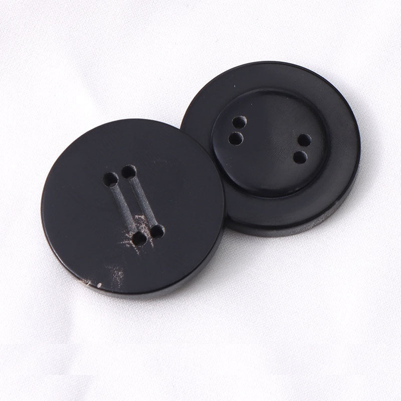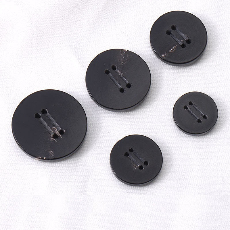 Тези копчета, с размери от 15 до 25мм, са изработени от истински рог. Кръглата форма с четири дупки и дизайн с двойна канавка ги прави изключително отличителни. Черният цвят предлага класически и универсален вид, подходящ за широка гама облекла, включително мъжки и дамски костюми, палта, тренчкоти и пуловери.