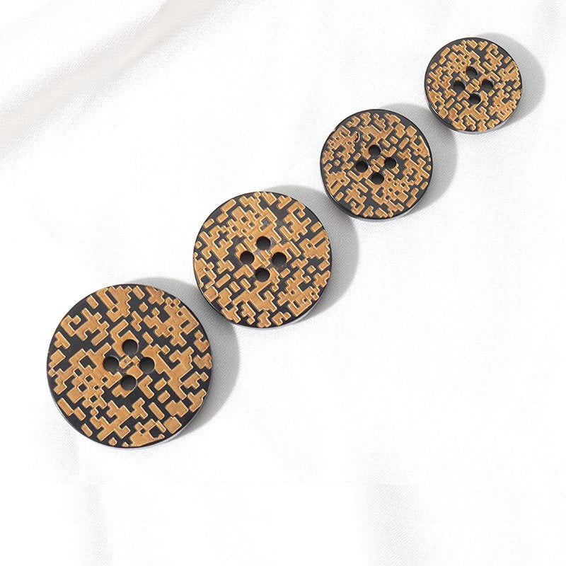 Тези копчета, с размери от 15 до 25 мм, са изработени от истински рог и имат кръгла форма с четири отвора. Уникалното лазерно обработено пожълтяване и винтидж износен завършек им придават висококласен, ретро вид. Ефектът на пожълтяване добавя усещане за възраст и автентичност, сякаш копчетата имат дълга история.