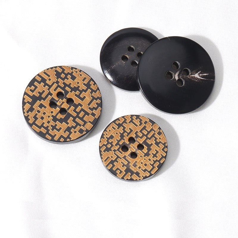 Истинският материал от рог осигурява издръжливост и естествена текстура. Дизайнът с четири отвора ги прави подходящи за различни дрехи. Тези копчета не са само функционални, но и служат като стилен акцент, подобрявайки цялостната естетика на облеклото. Независимо дали е класически костюм, изискано палто или рокля с ретро вдъхновение, тези лазерно обработени копчета от рог ще придадат нотка елегантност и чар, правейки дрехата да изпъква с комбинация от лукс и винтидж привлекателност.
