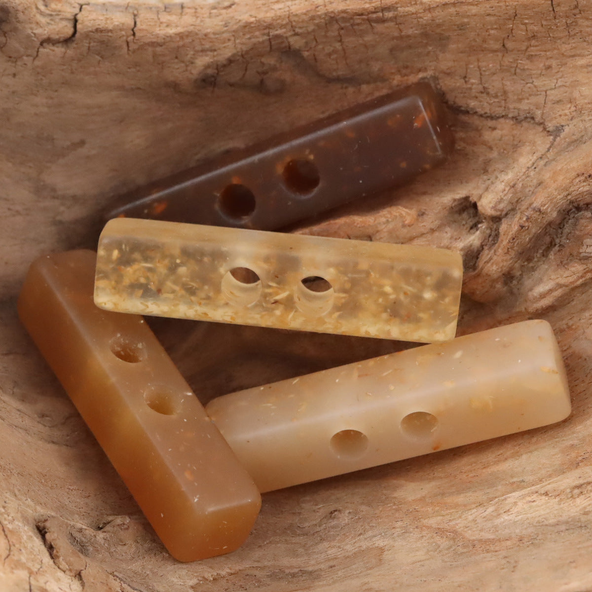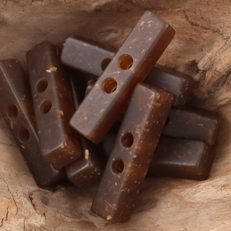 Тези смолни копчета са проектирани с дълга - ивица форма и имат привличащ вниманието дървесен - чип - текстуриран модел. Конфигурацията с 2 отвора не е само практична, но и допринася за уникалния им външен вид. Дървесният - чип - модел придава на копчетата естествен и рустикален вид, сякаш са направени от истинско дърво, като същевременно са по-издръжлива и икономична алтернатива от смола.