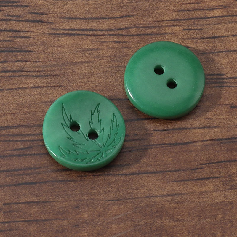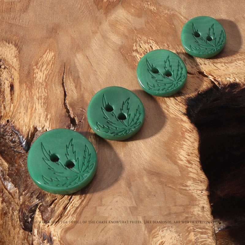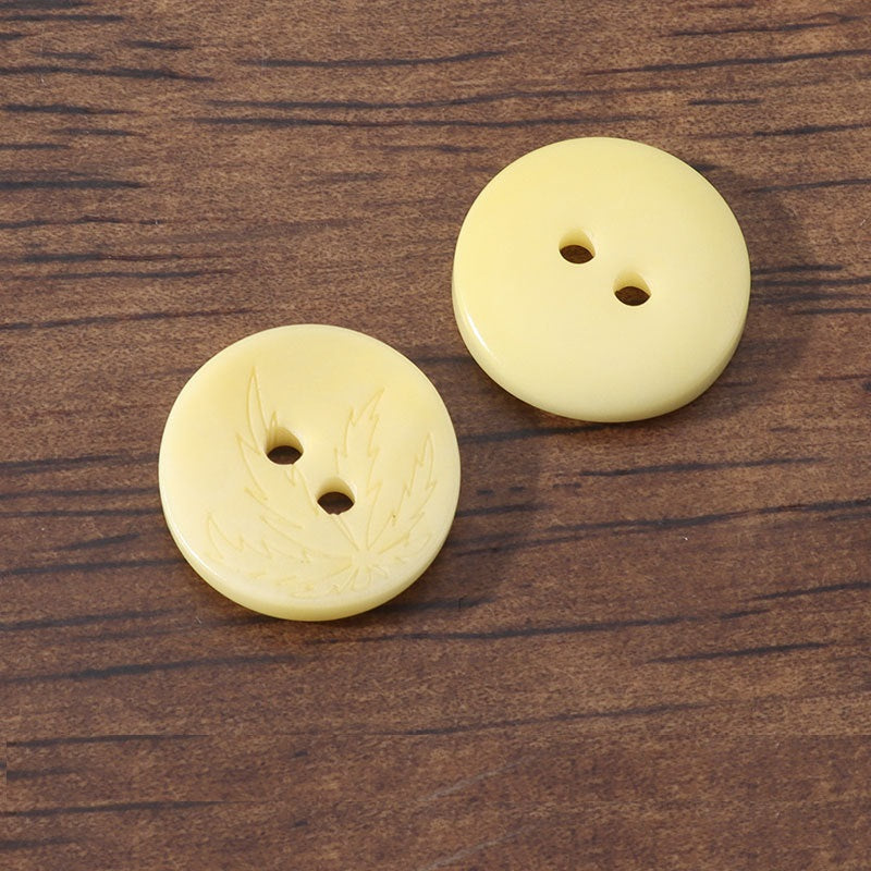 Тези бутони, с размери между 10 и 15 мм, са изработени от натурални плодове и се отличават с очарователна комбинация от жълти и авокадо зелени цветове. Кръглата форма с два отвора е както практична, така и естетически приятна. Това, което ги отличава, е лазерно гравираният листен мотив, добавящ щрих на елегантност, вдъхновена от природата.