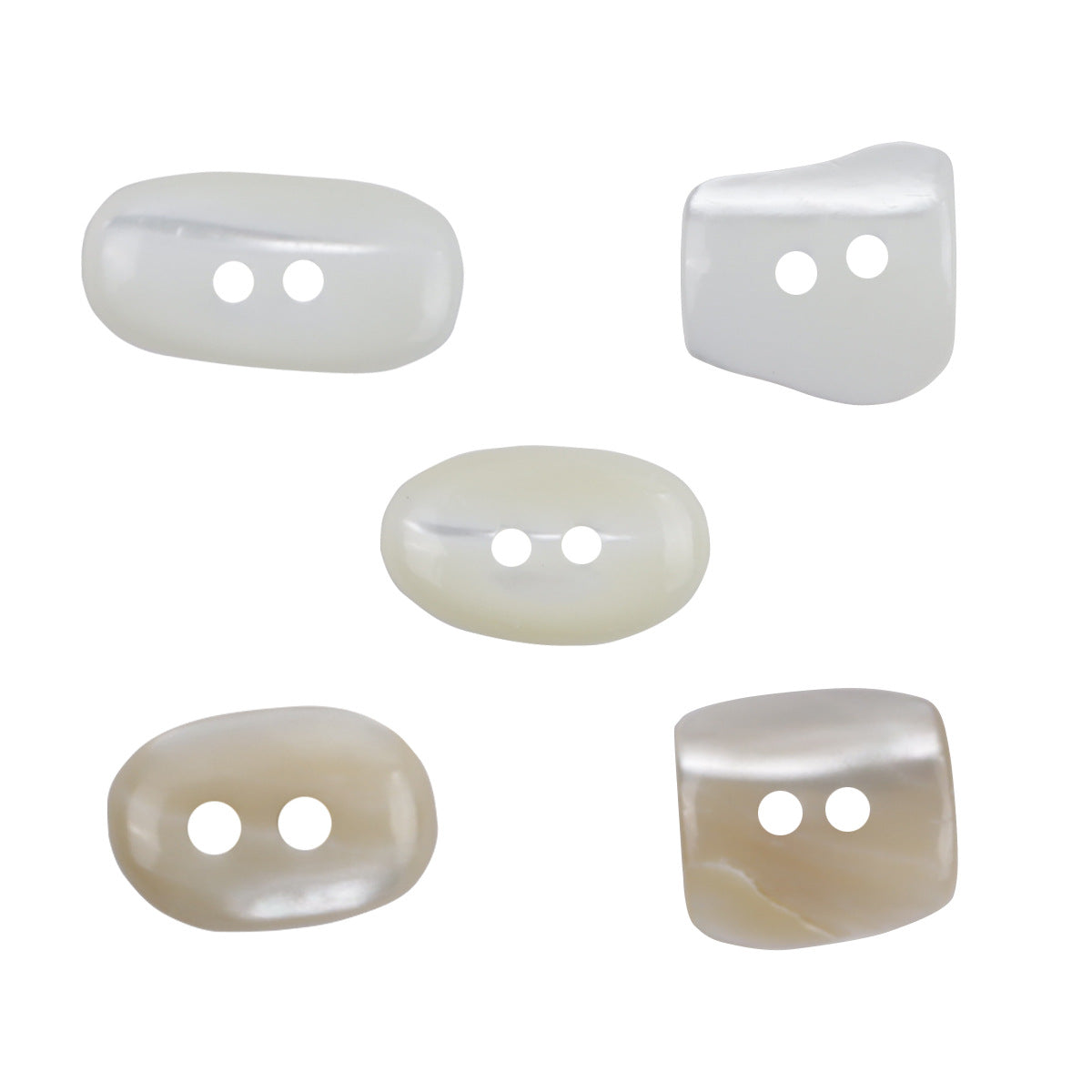 Тези неправилни овални кремаво-бели копчета от черупка са красив и уникален акцент за всяка риза. Изработени от естествена черупка, тези копчета имат гладка и лъскава повърхност, която добавя нотка елегантност.