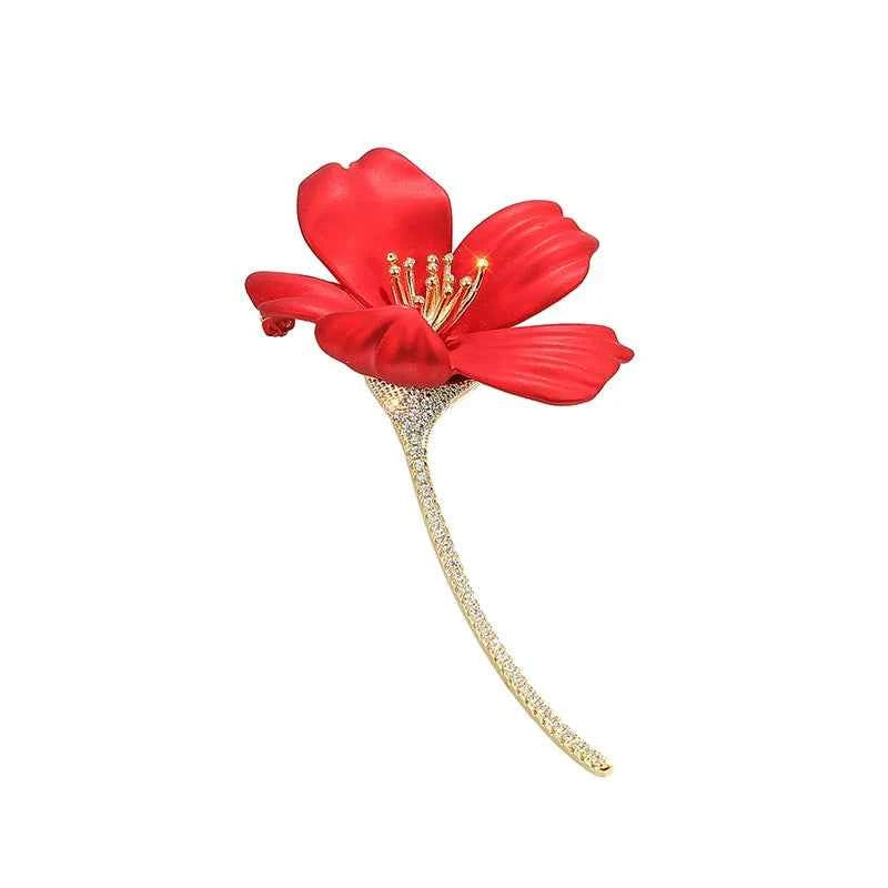 Luxusní brož s červeným ibiškem a zirkony – elegantní květinová spona