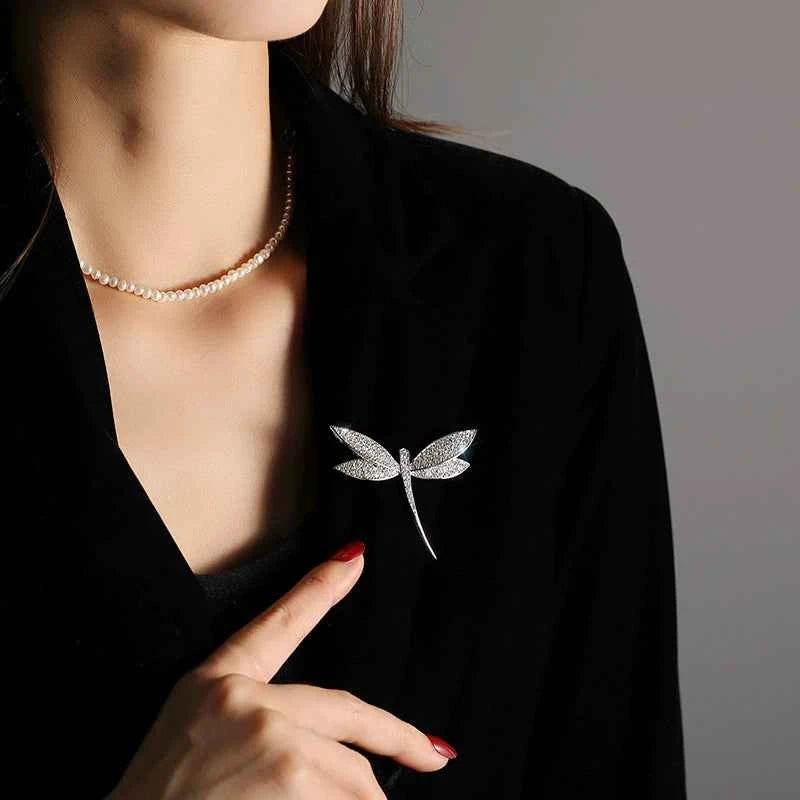 Brož ve stříbrném tónu ve tvaru vážky – plně zdobená třpytivými zirkonovými kameny