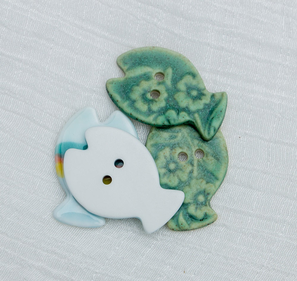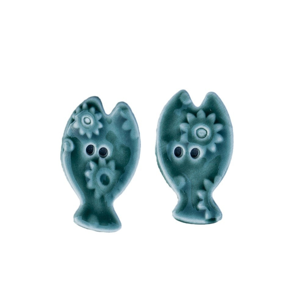33mm zelené mechové barevné keramické knoflíky ve tvaru ryby se 2 dírkami, 6 kusů