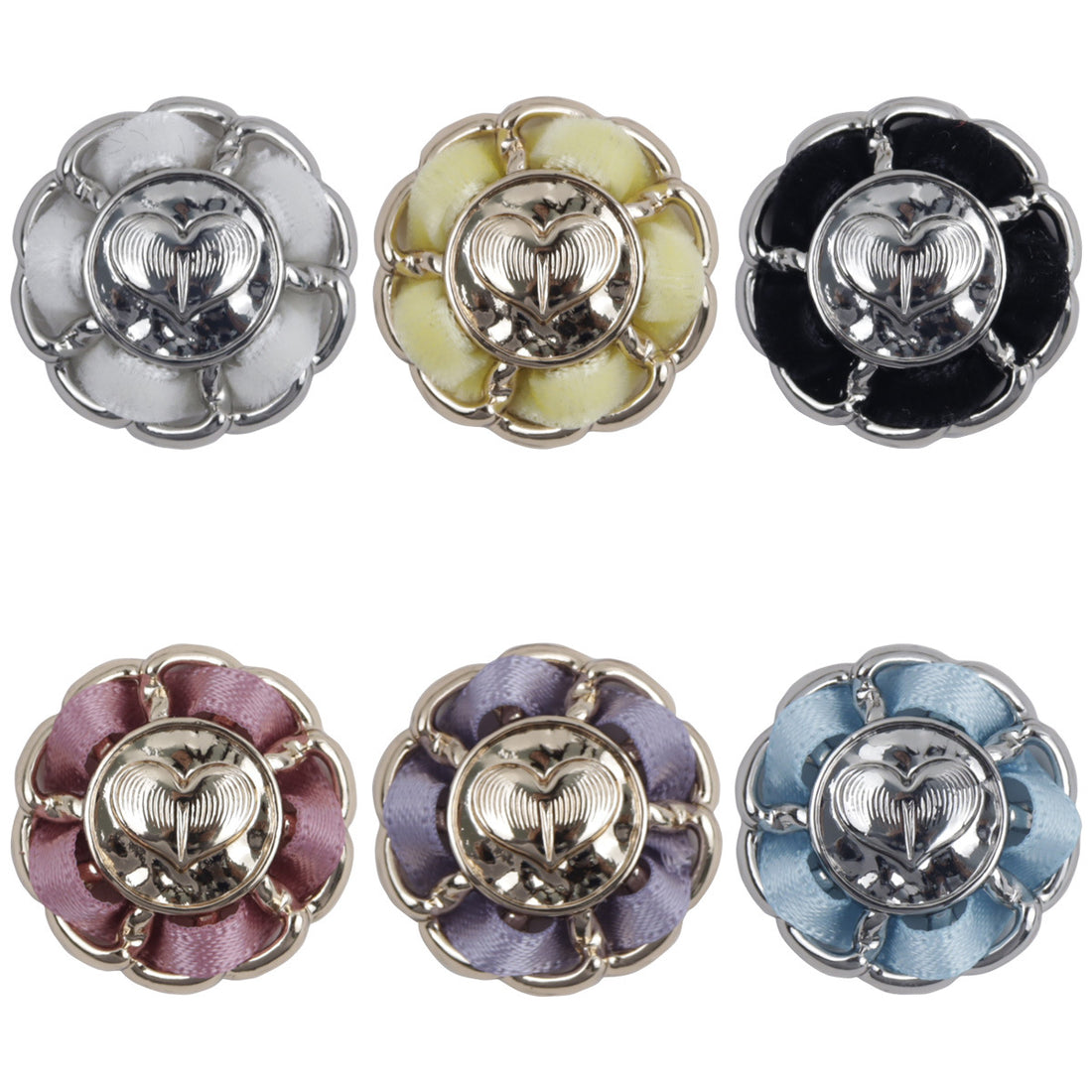 Kovový knoflík ve tvaru srdce s diamantem a květinou čtyřlístku, 6 kusů