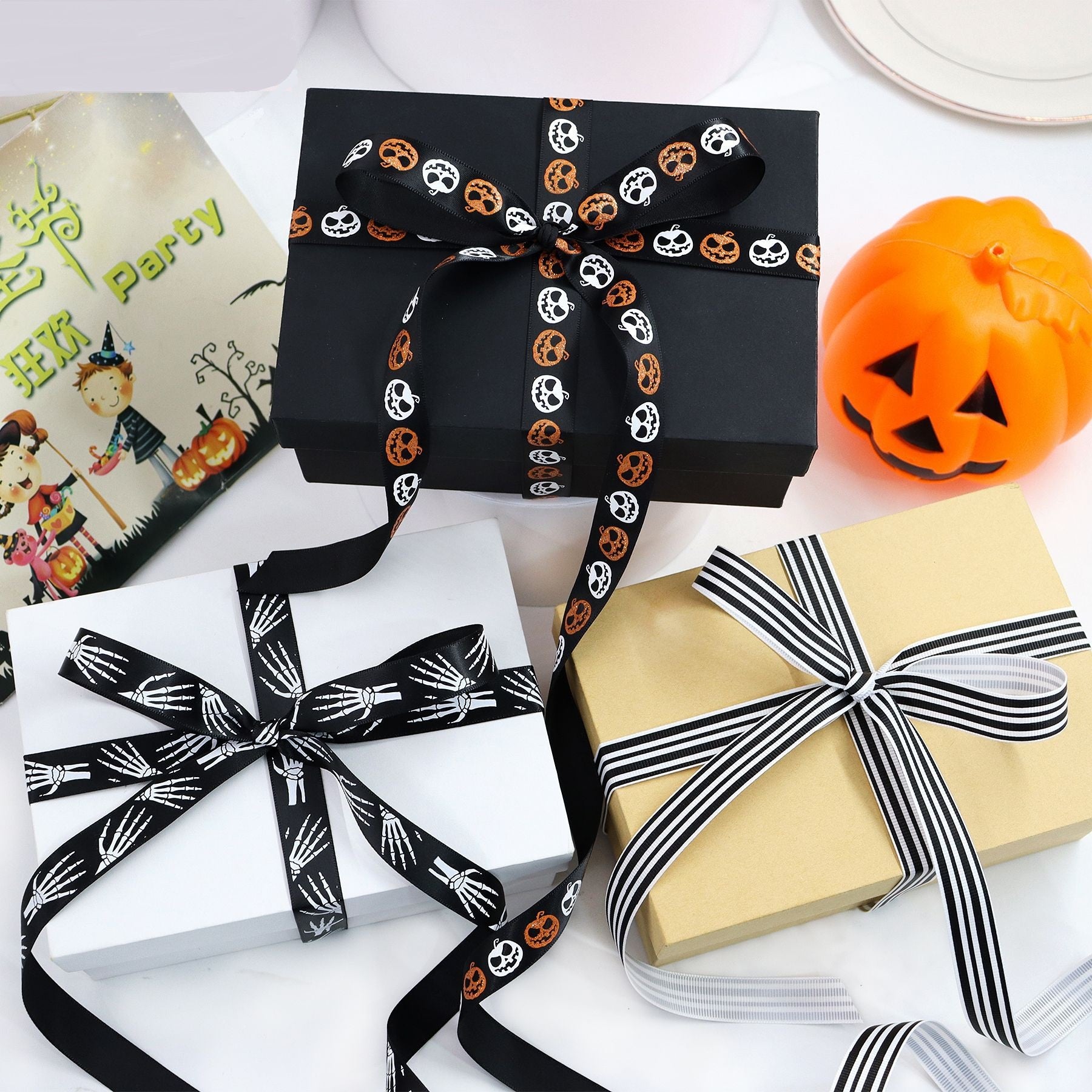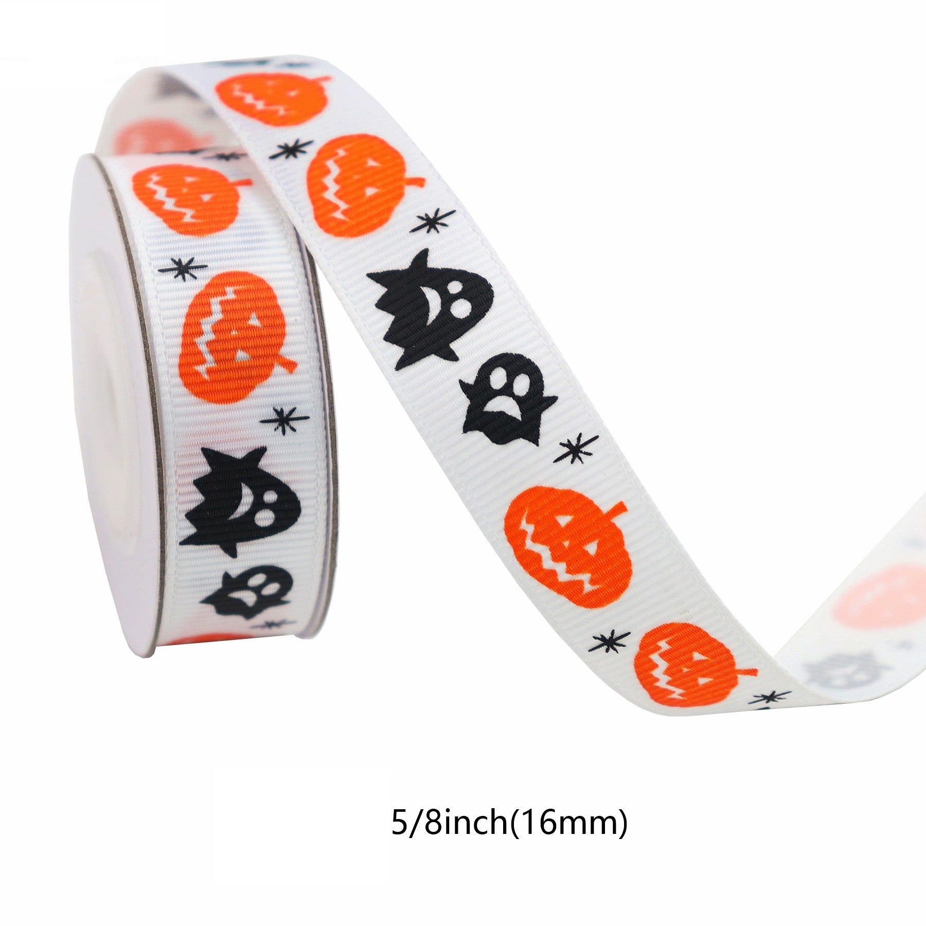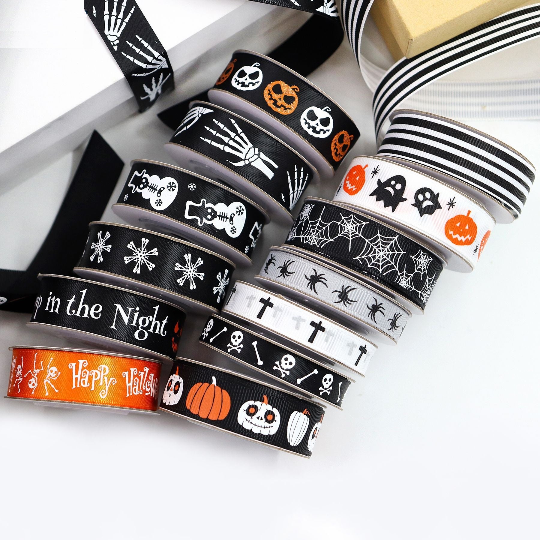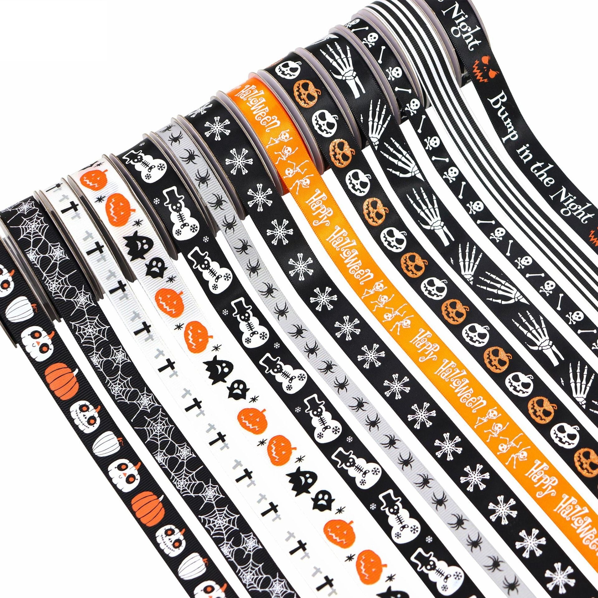 10/16mm stuhy s halloweenskými motivy s dýní, lebkou, pavučinou a tváří ducha, 13 balení, 65 yardů (5 yardů na roli)