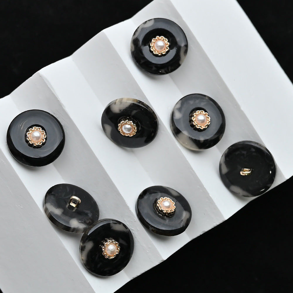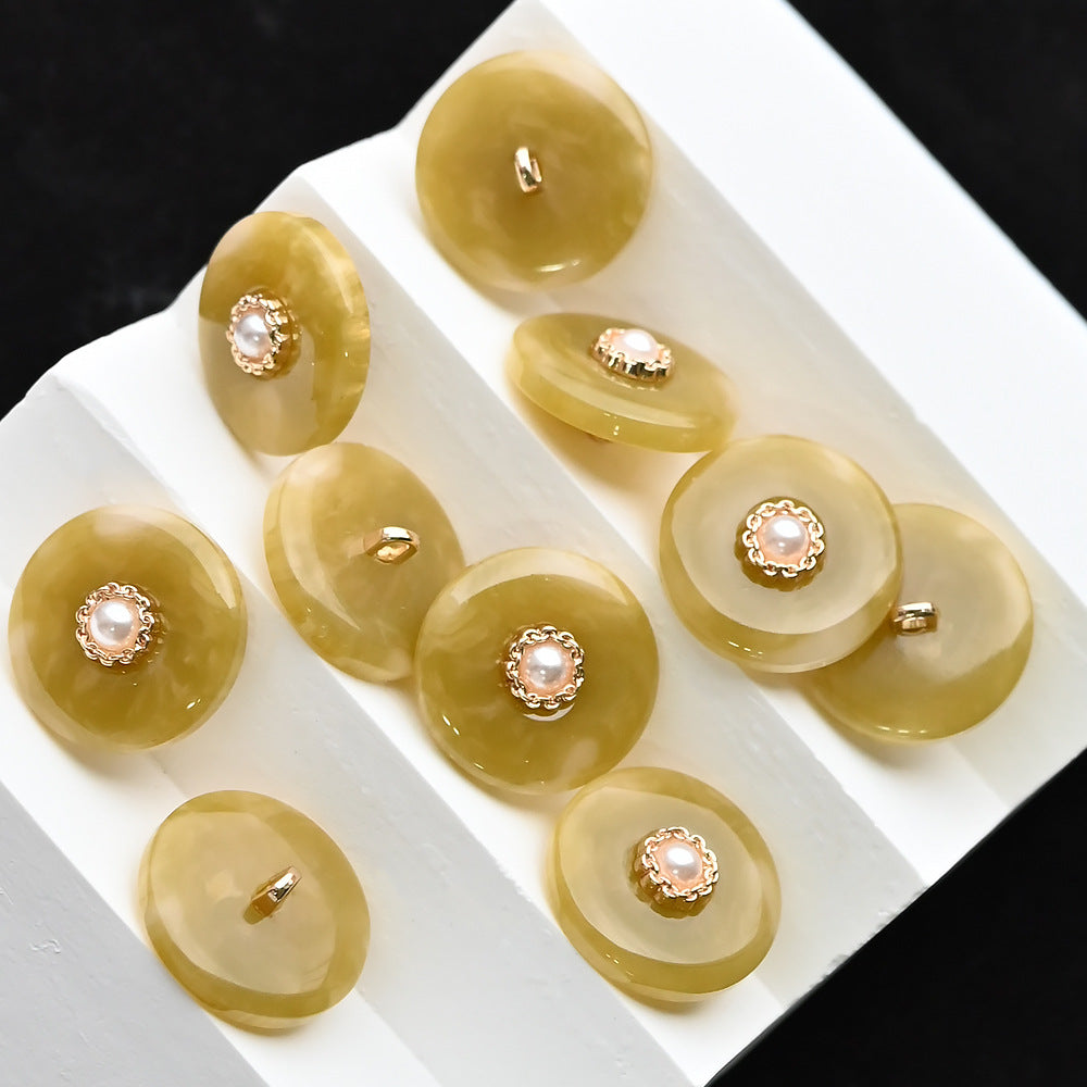 Tyto knoflíky o velikosti od 11,5 do 20 mm jsou jedinečnou kombinací perlové pryskyřice a slitiny. Hořčicově žluté a černé barvy vytvářejí výrazný kontrast, který dodává ženskému oblečení nádech sofistikovanosti a odvahy.