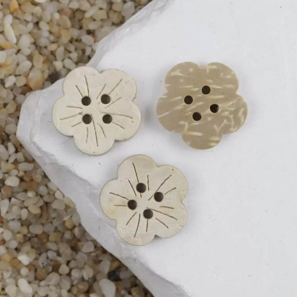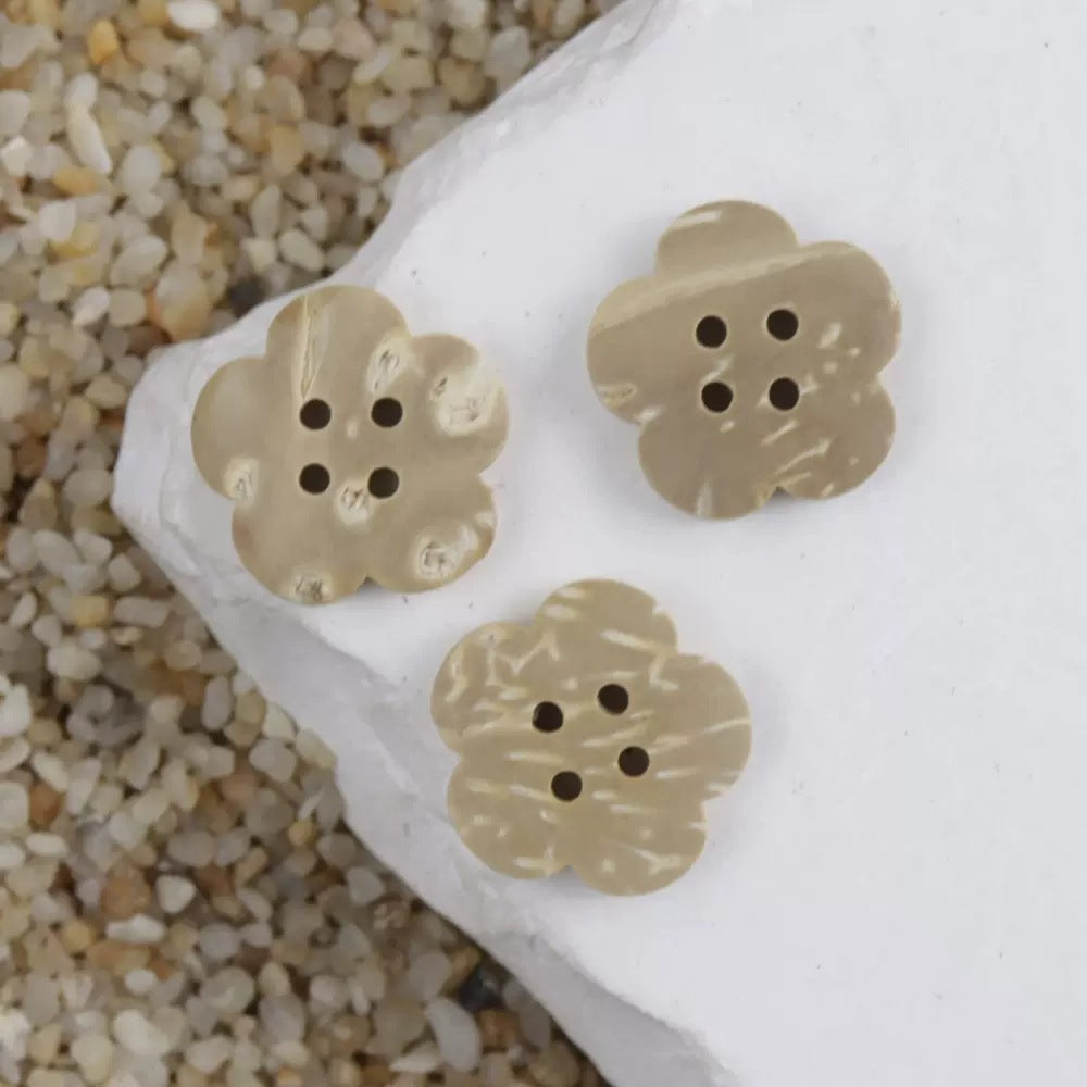 Tyto jedinečné knoflíky jsou vyrobeny z kokosové skořápky v krásném květinovém tvaru a mají čtyři dírky. K dispozici ve velikostech 15mm a 17,5mm, ukazují přirozenou texturu a barvu kokosové skořápky.