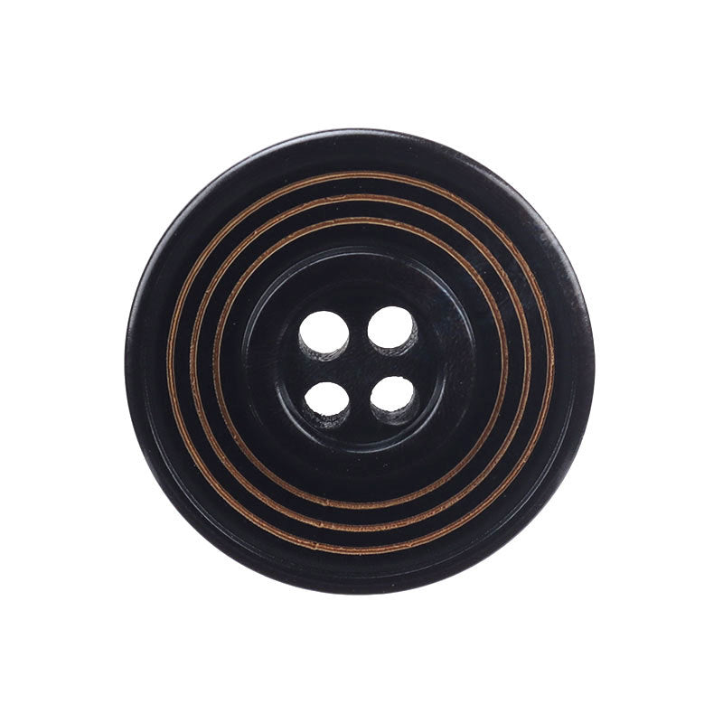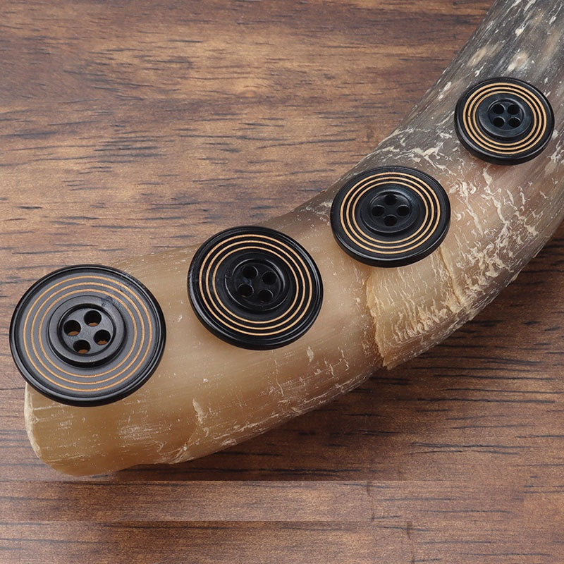 Tyto knoflíky o velikosti od 15 do 23 mm jsou vyrobeny z pravého rohu a mají jedinečný laserový vzor. Kulatý tvar se čtyřmi dírkami nabízí jak funkčnost, tak klasickou estetiku. Laserové linie přidávají moderní a umělecký nádech, díky čemuž tyto knoflíky vynikají.