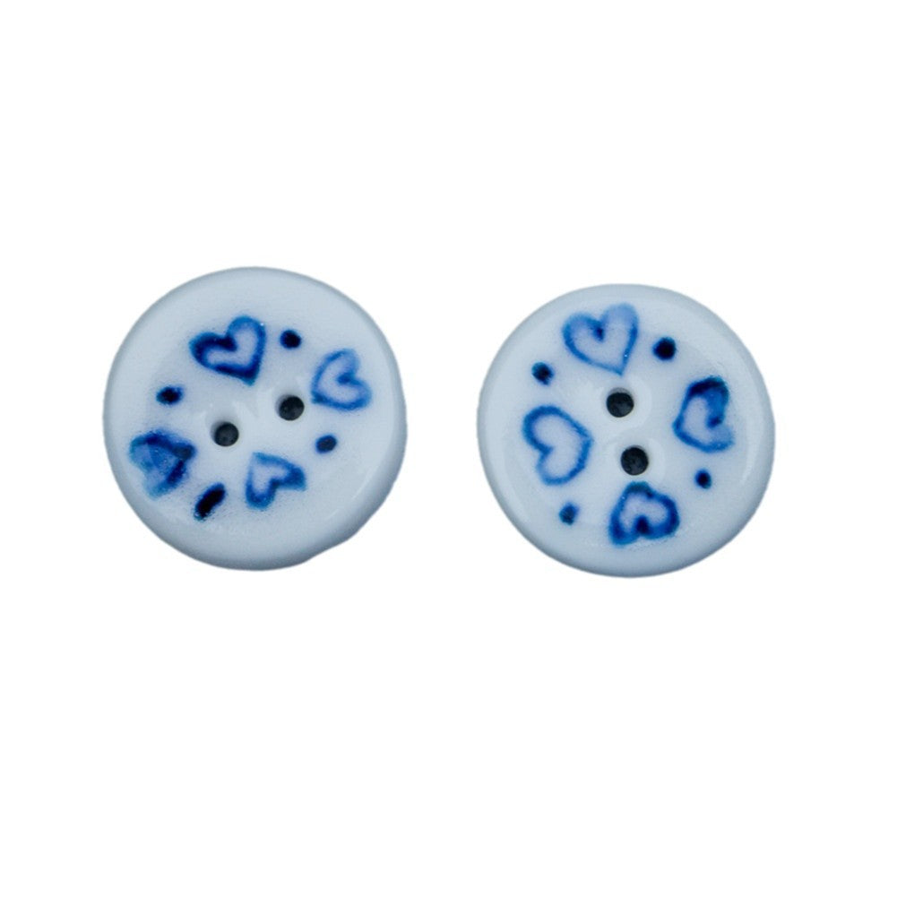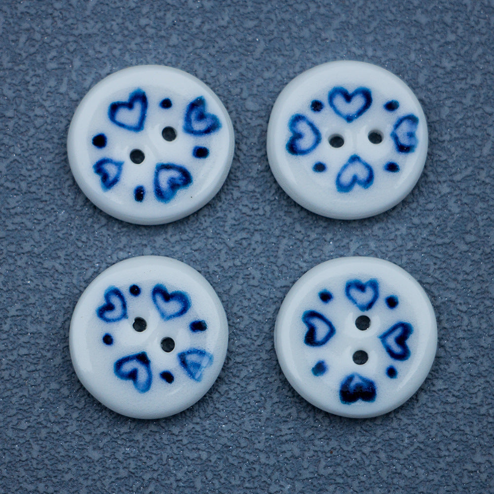 Tyto keramické knoflíky o průměru 15,6 mm jsou jedinečným a půvabným doplňkem každého kreativního projektu. Knoflíky jsou kulaté se dvěma dírkami a mají ručně malovaný modro-bílý porcelánový motiv srdce.
