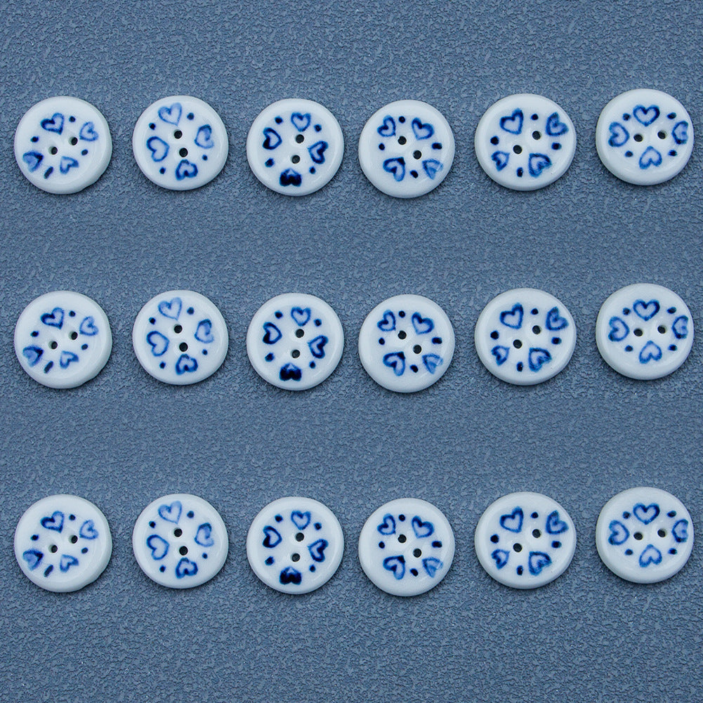 15,6mm kulaté keramické knoflíky se dvěma dírkami, ručně malované modro-bílé porcelánové srdce, 6 ks