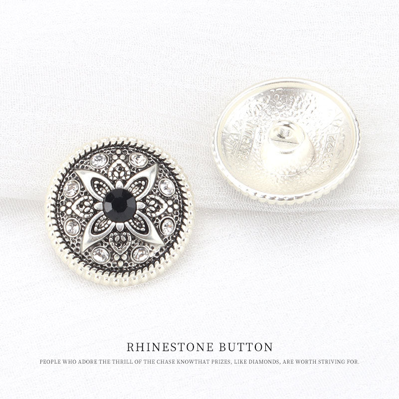 21mm Vintage stříbrné kovové knoflíky s černým květinovým vzorem z kamínků 5 ks