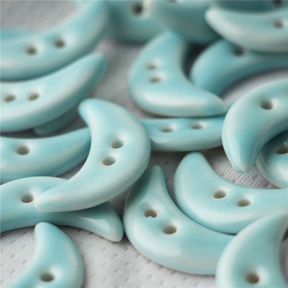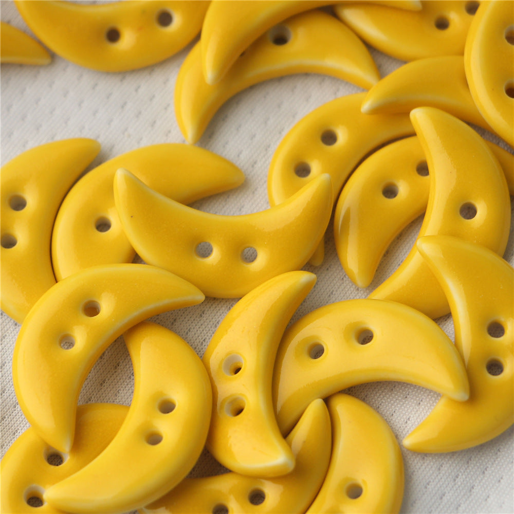 Tyto jedinečné keramické knoflíky o velikosti 28 mm jsou navrženy v půvabném tvaru půlměsíce se dvěma dírkami. Kombinace žluté a světle modré barvy vytváří svěží a poutavý vzhled. Jsou speciálně vyrobeny pro dekoraci tašek, přidávají eleganci a osobitost každé tašce.