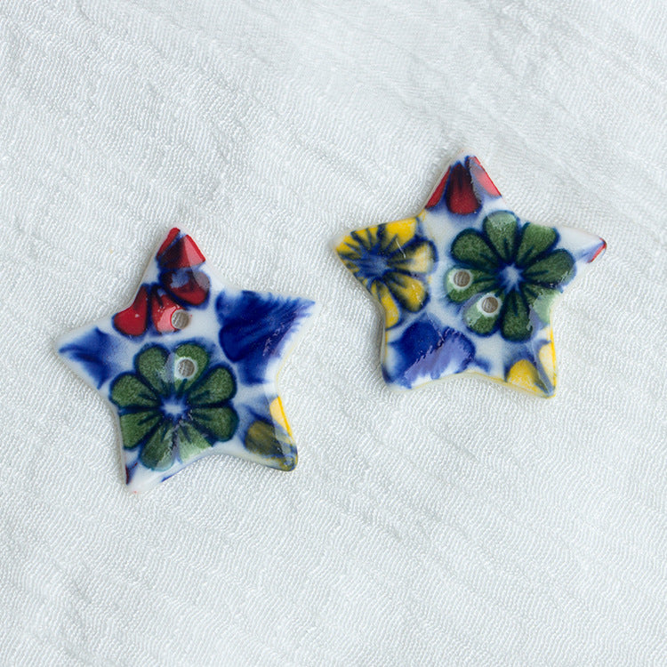 Tyto 30mm keramické knoflíky jsou výrazným doplňkem DIY projektů. Tvarované jako pentagram, zobrazují poutavou kombinaci bordó a světle modrých barev. Ručně vyrobené s péčí, každý knoflík má dva otvory pro pohodlné připevnění.