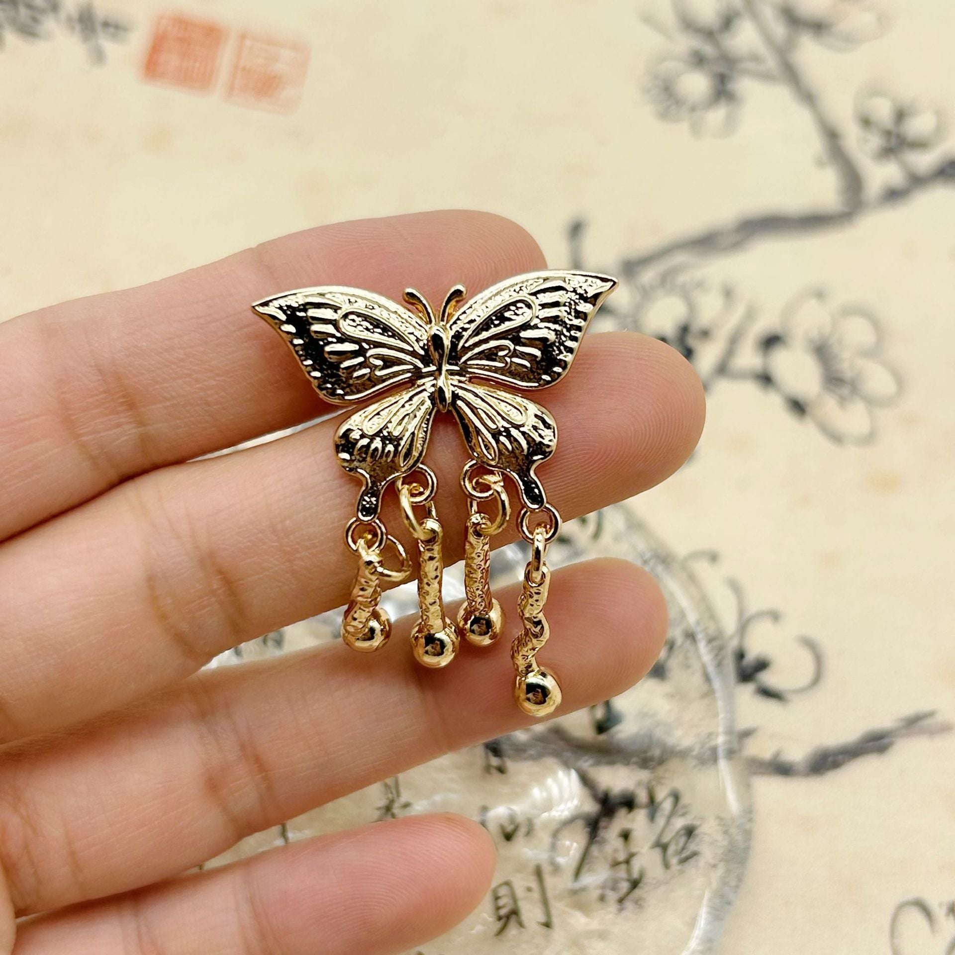 Tyto 30mm kovové knoflíky jsou výrazným prvkem čínského stylu. Zlatý motýl je mistrovsky zpracován a doplněn plynoucími střapci, které dodávají dynamiku a eleganci. Nejsou vhodné pouze pro cheongsam, ale také skvěle ozdobí kabáty a svetry. Kovová konstrukce zajišťuje odolnost a luxusní lesk. Tyto knoflíky mohou proměnit obyčejný oděv v umělecké dílo, zvýraznit jeho celkovou estetiku a učinit ho výjimečným. Ať už jde o formální událost nebo stylový výlet, přinášejí jedinečné kouzlo a pocit bohatství čínské kultury.
