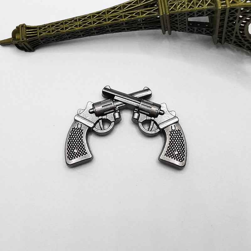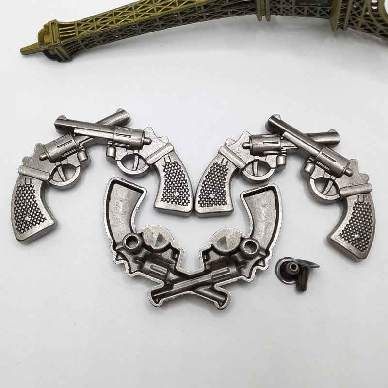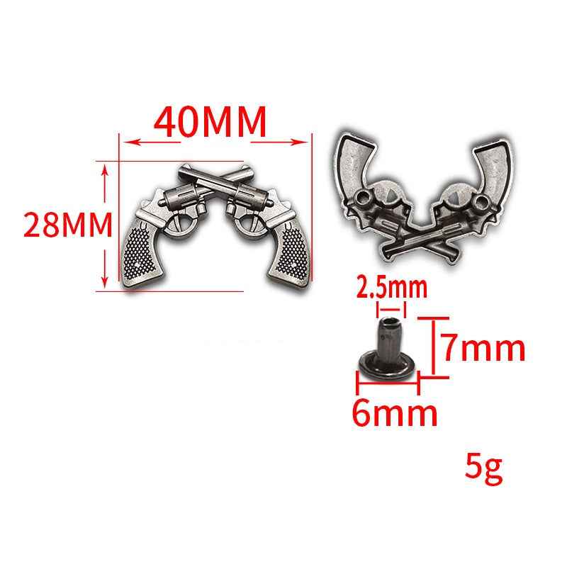 Ozbrojte svůj styl těmito masivními 40x28MM dvojitými kovovými nýty - ultimátní výraz pro tvrdé bikery a punkové bojovníky! Tyto průmyslové zinkové slitiny hroty mají propracovaně zkřížené pistole se starostříbrným opotřebovaným povrchem, navržené k proměně vašeho: