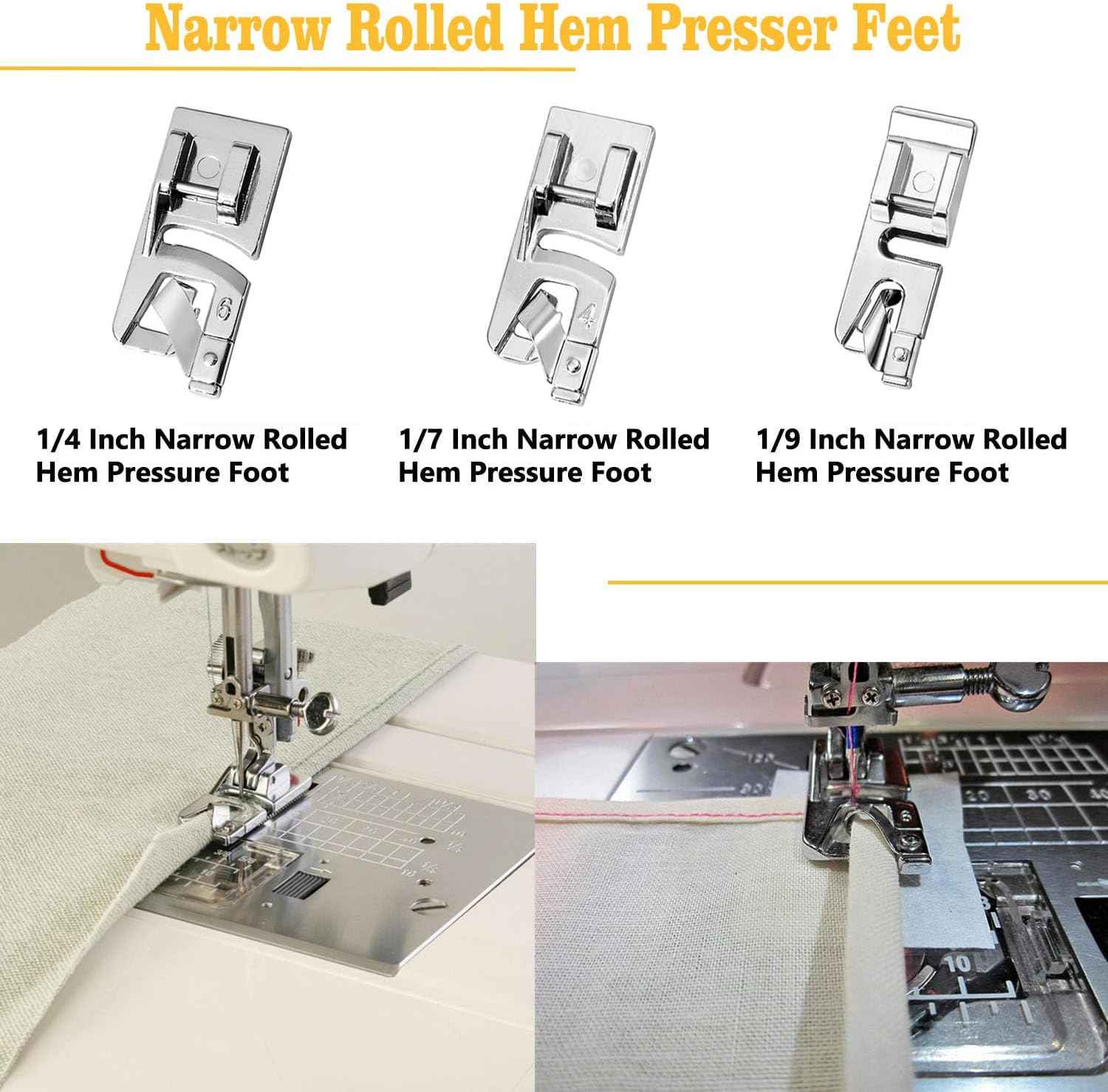 Úzké patky pro rolovaný lem: Lze použít na většině domácích šicích strojů s nízkým ramenem; Vhodné pro některé tenké látky pro overlockový steh.