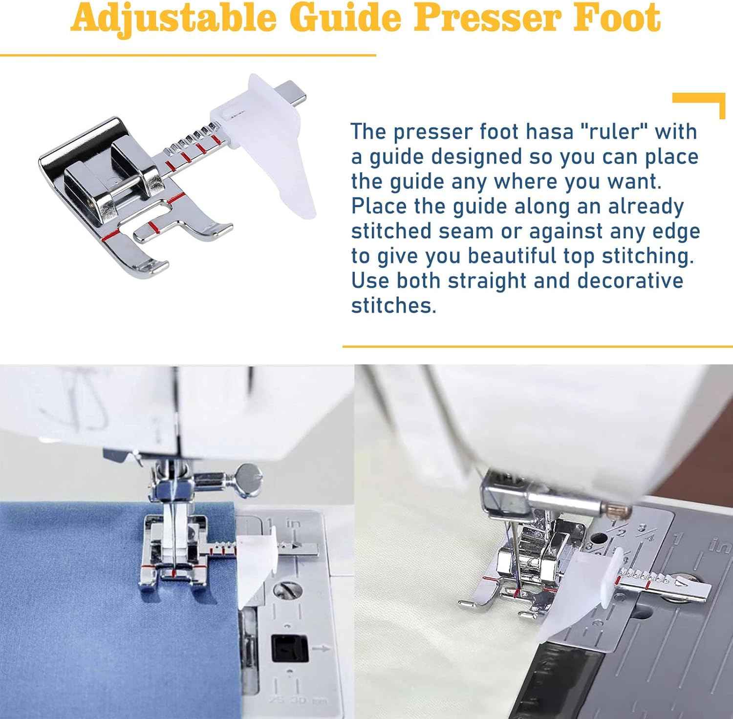Nastavitelná vodicí patka: Má "pravítko" s navrženým vodítkem. Umístěte vodítko podél již prošitého švu nebo podél okraje, abyste získali krásné vrchní šití. Patka dokonale vede vaše vrchní a dekorativní šití.