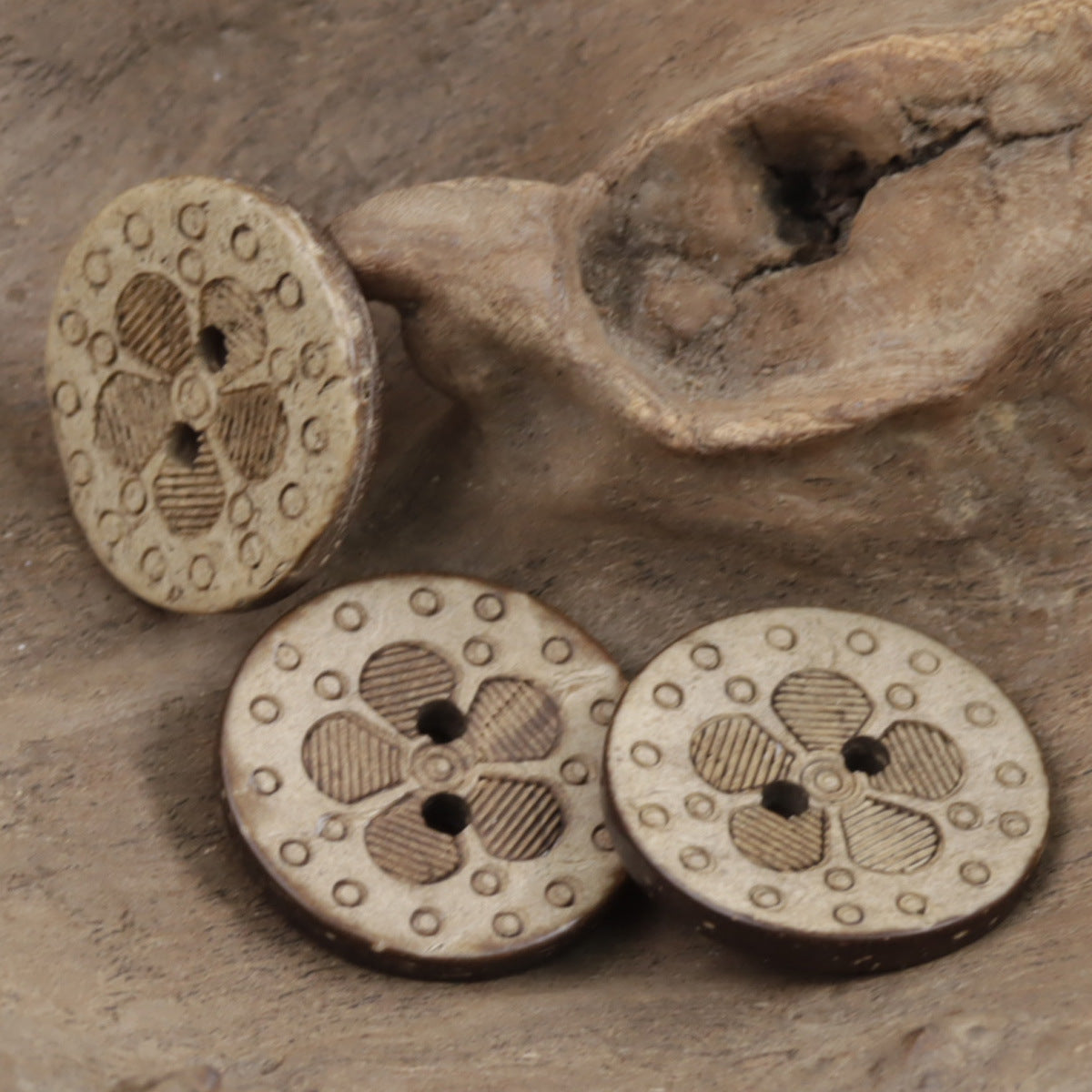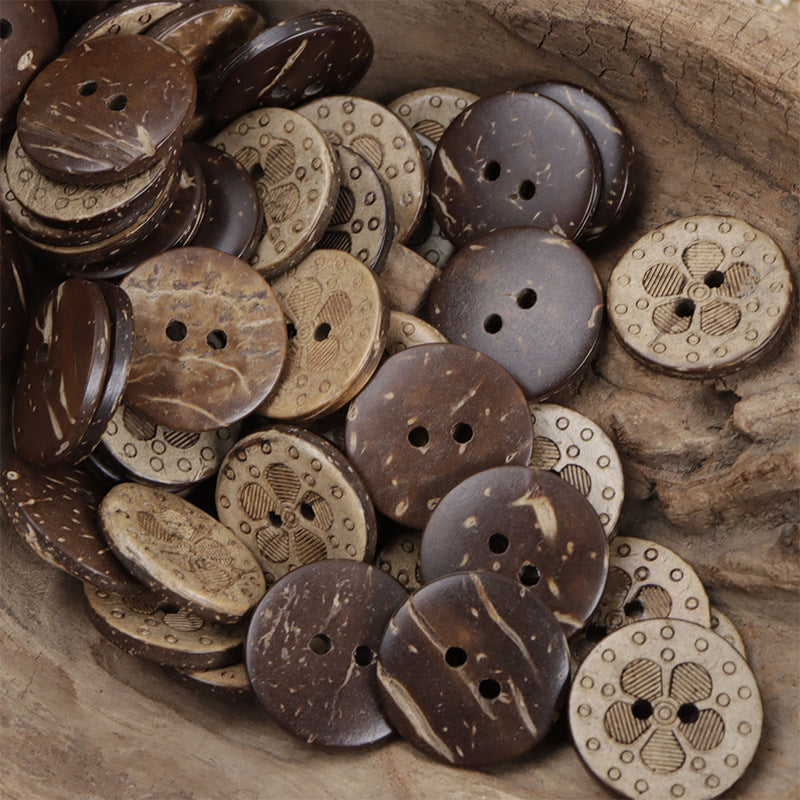 Vnesťe do svých návrhů organický a elegantní prvek s našimi vintage knoflíky z přírodní kokosové skořápky v černé kávové barvě se 4 dírkami. Tyto knoflíky jsou vyrobeny z pravých kokosových skořápek, což nabízí udržitelnou a ekologickou možnost pro vaše módní potřeby. Vintage černá kávová barva jim dodává sofistikovaný a nenápadný vzhled, který doplňuje různé styly, zejména vhodné pro bílé košile, svetry a pleteniny.