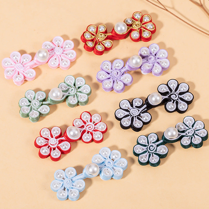 Čínský cheongsam knoflík s uzávěrem ve tvaru žabky, perlový, ručně tkaný s motivem šesti okvětních lístků, balení 8 barev
