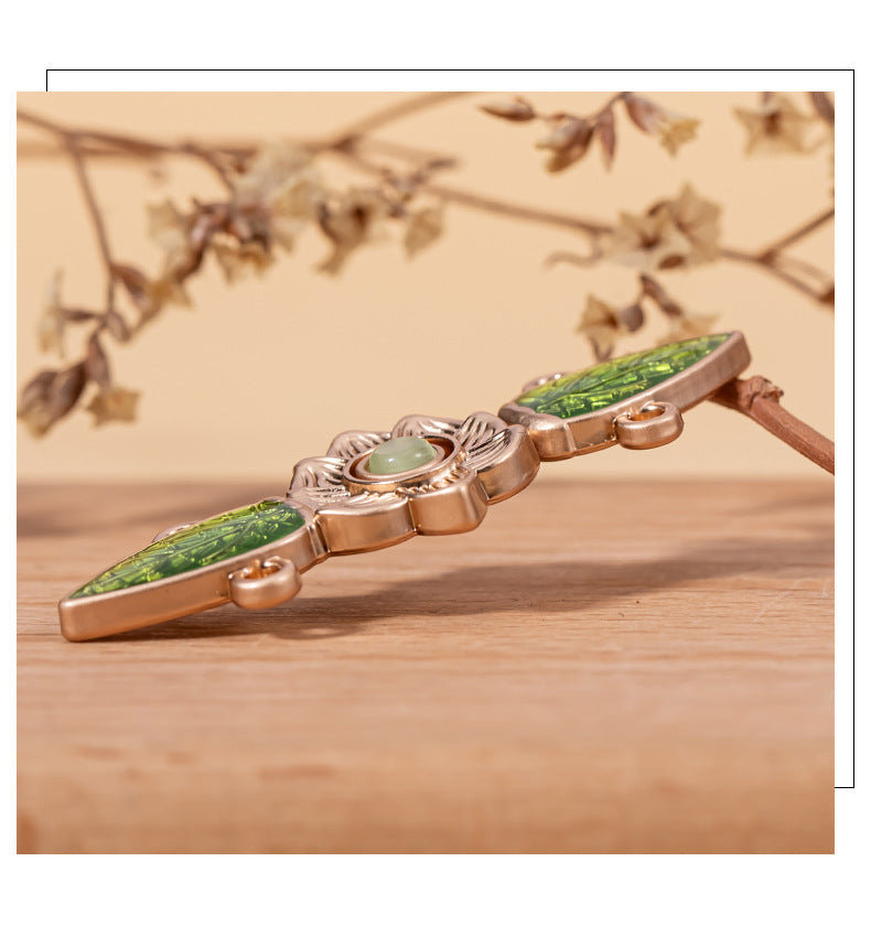 Tento kovový zámkový knoflík ve stylu Hanfu s motivem zeleného listu a kočičího oka je ohromujícím kouskem řemeslné práce. Knoflík zdobí krásný motiv zeleného listu, detailně propracovaný a vyrobený z vysoce kvalitního kovu. Uprostřed listu dodává jiskřivý kámen kočičího oka nádech elegance a půvabu.
