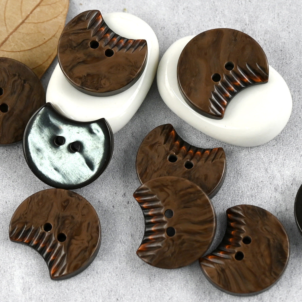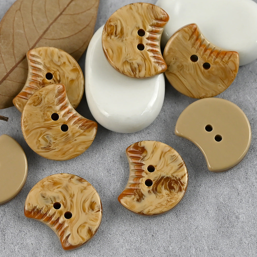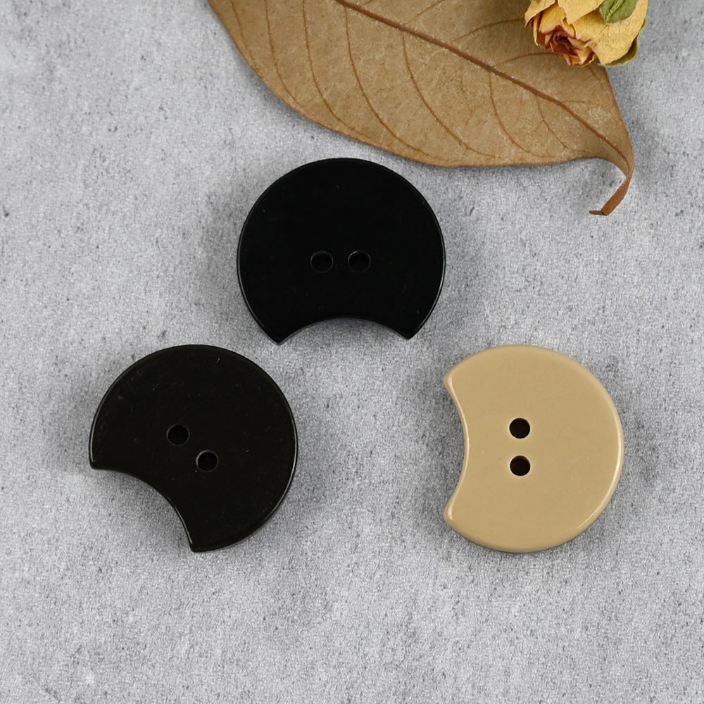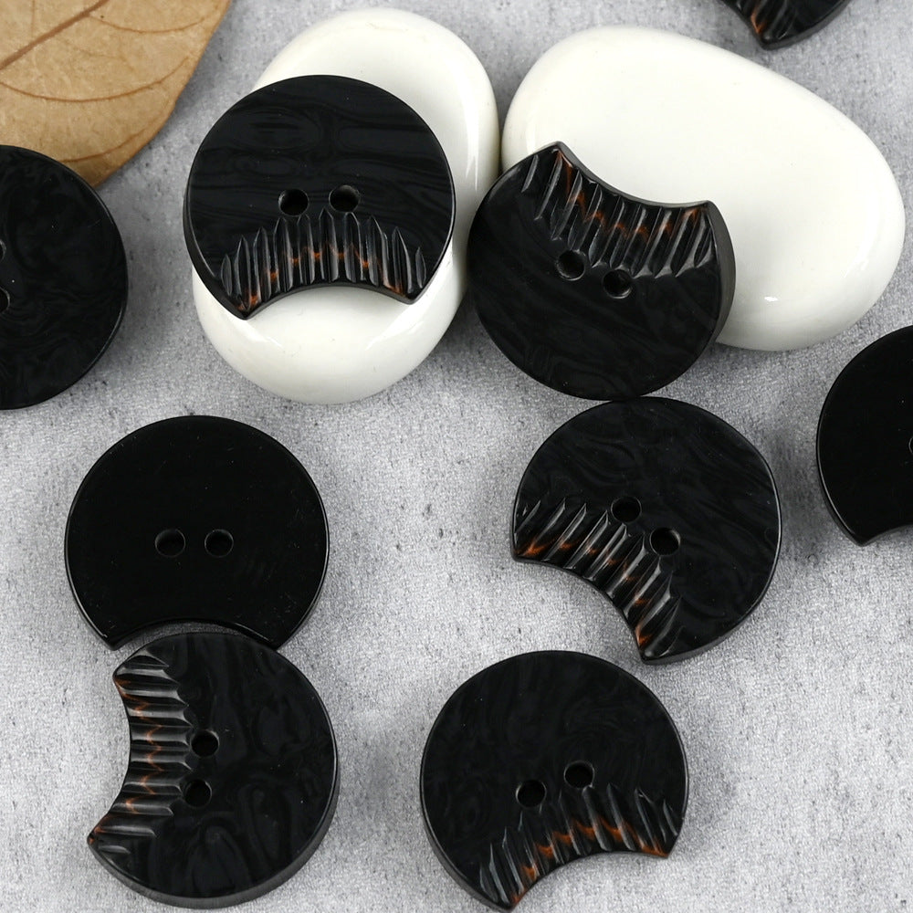Tyto jedinečné pryskyřičné knoflíky jsou vyrobeny v nepravidelném tvaru půlměsíce, inspirovaném motivem malého ďábla. Mají oboustranný design, který přidává všestrannost a zábavu.