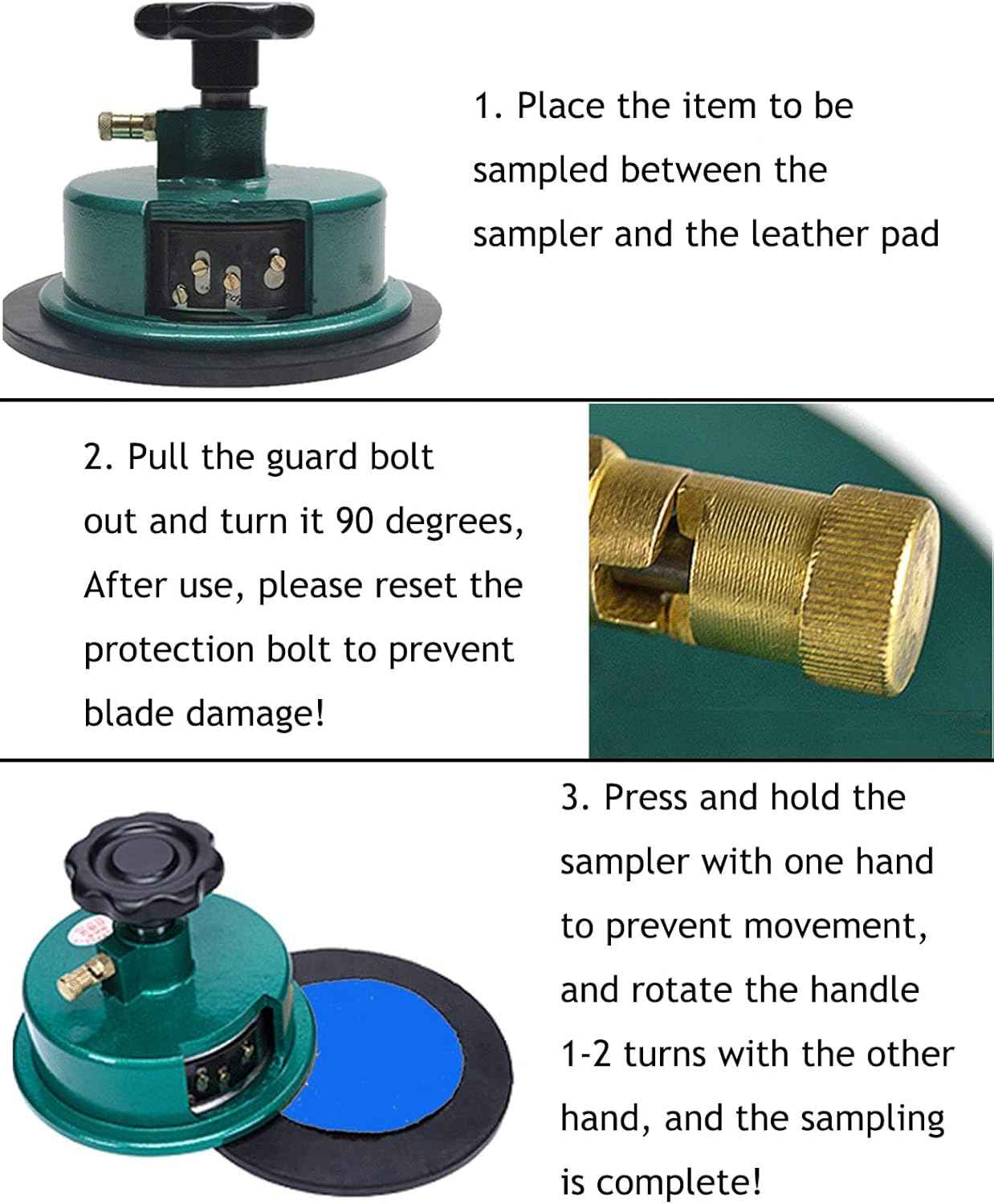 Použití: Položte dlaždici, kterou je třeba řezat, na gumovou podložku z látky, položte diskový vzorkovač na látku, zatáhněte za zámek na vzorkovači, otočte asi o 90 stupňů, držte kryt jednou rukou, druhou rukou držte vroubkované kolečko a vyvíjejte určitý tlak, poté otáčejte vroubkované kolečko po směru hodinových ručiček (úhel větší než 90 stupňů), čímž se vzorek vyřízne