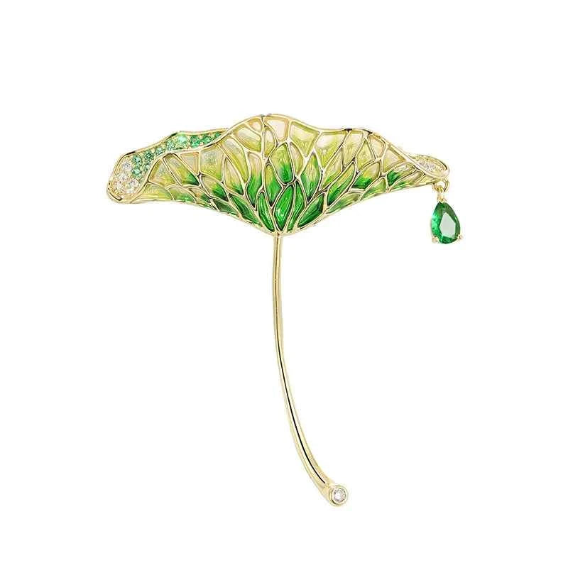 Zlatá zelená smaltovaná brož lotosový list s kapkou vody a zirkonem