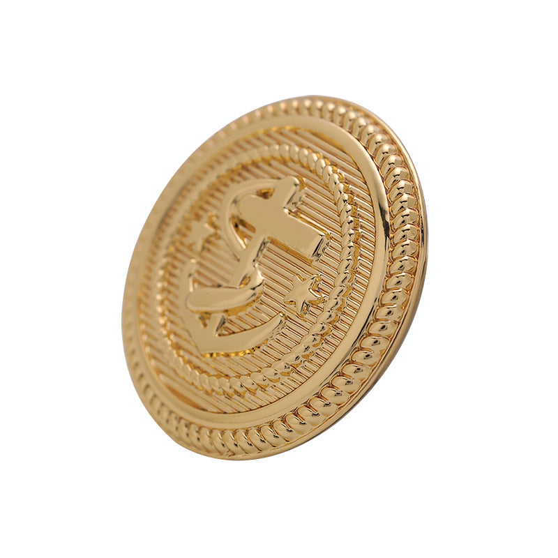 Tento módní kovový kulatý knoflík se zlatým vzorem kotvy je stylový a poutavý doplněk. Knoflík má krásný kulatý tvar s detailním zlatým motivem kotvy. Kovový materiál mu dodává odolný a kvalitní pocit.