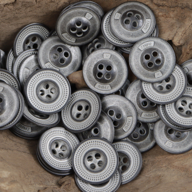 Tento jedinečný knoflík je navržen s charakteristickou zrnitou texturou a tvarem podobným víčku, což mu dodává autentický starožitný vzhled. Barva starožitného cínu dále zvýrazňuje jeho retro přitažlivost, což z něj činí perfektní doplněk k vaší oblíbené džínové bundě.