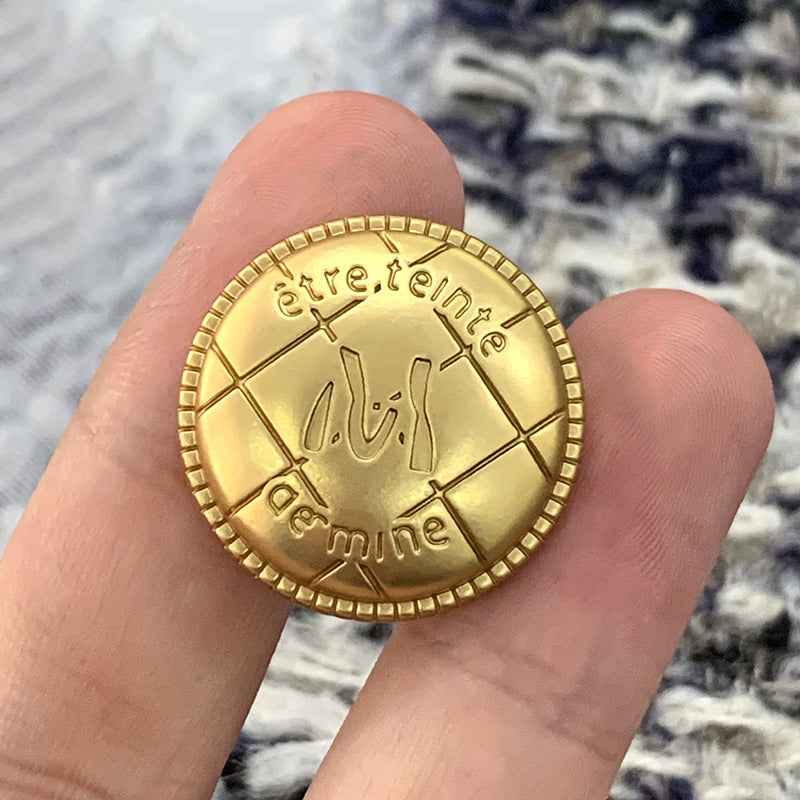 • Shape: Round metal buttons with a clear, centered "M" letter