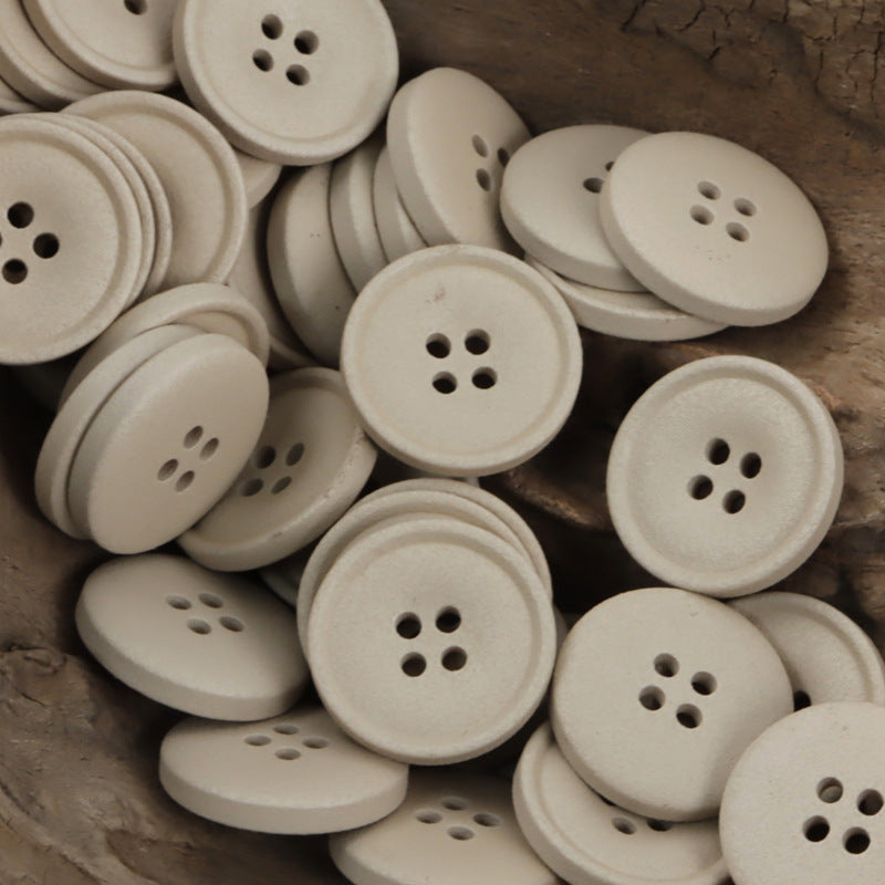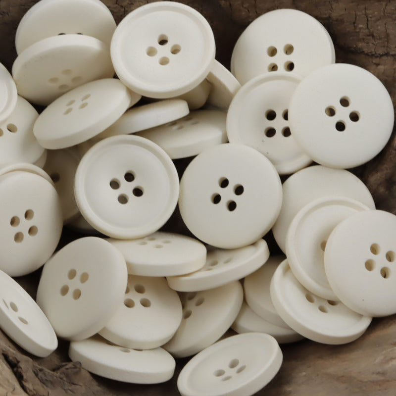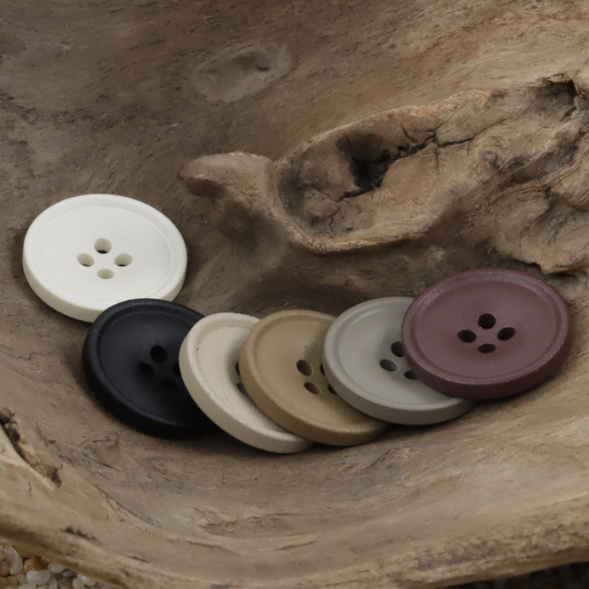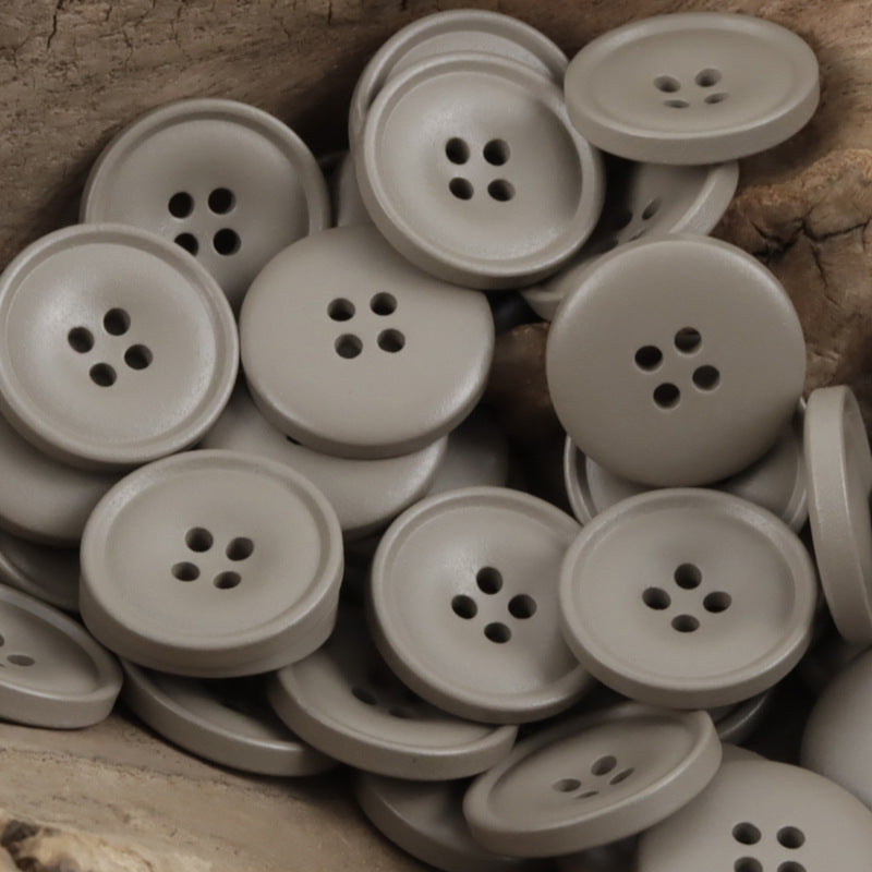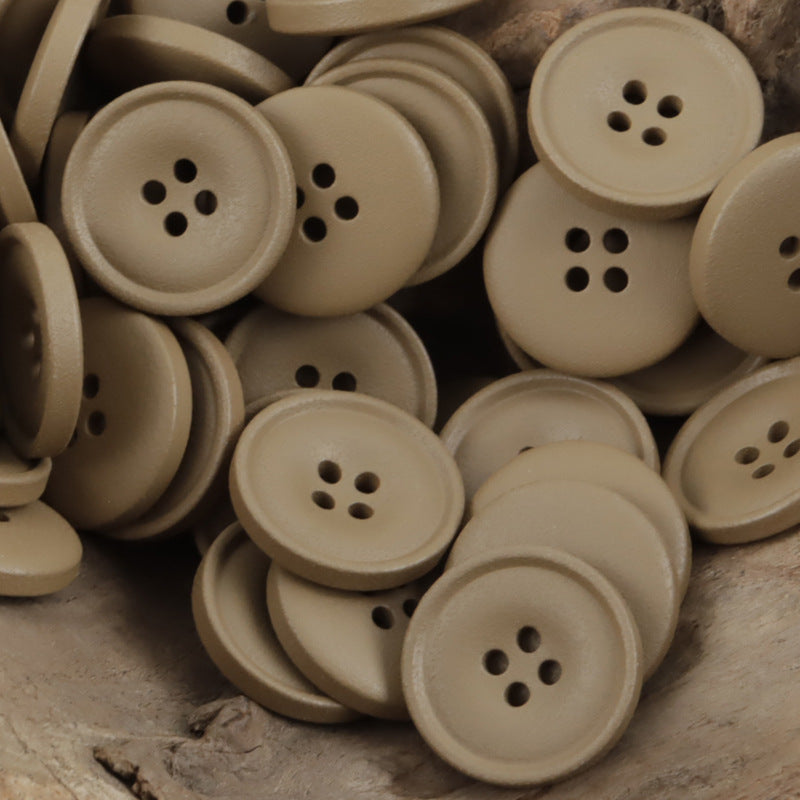 Matné knoflíky z pryskyřice pro podzimně-zimní khaki trenčkot a zemitě žlutý vlněný kabát, 4 dírky, kulaté, balení 50 ks