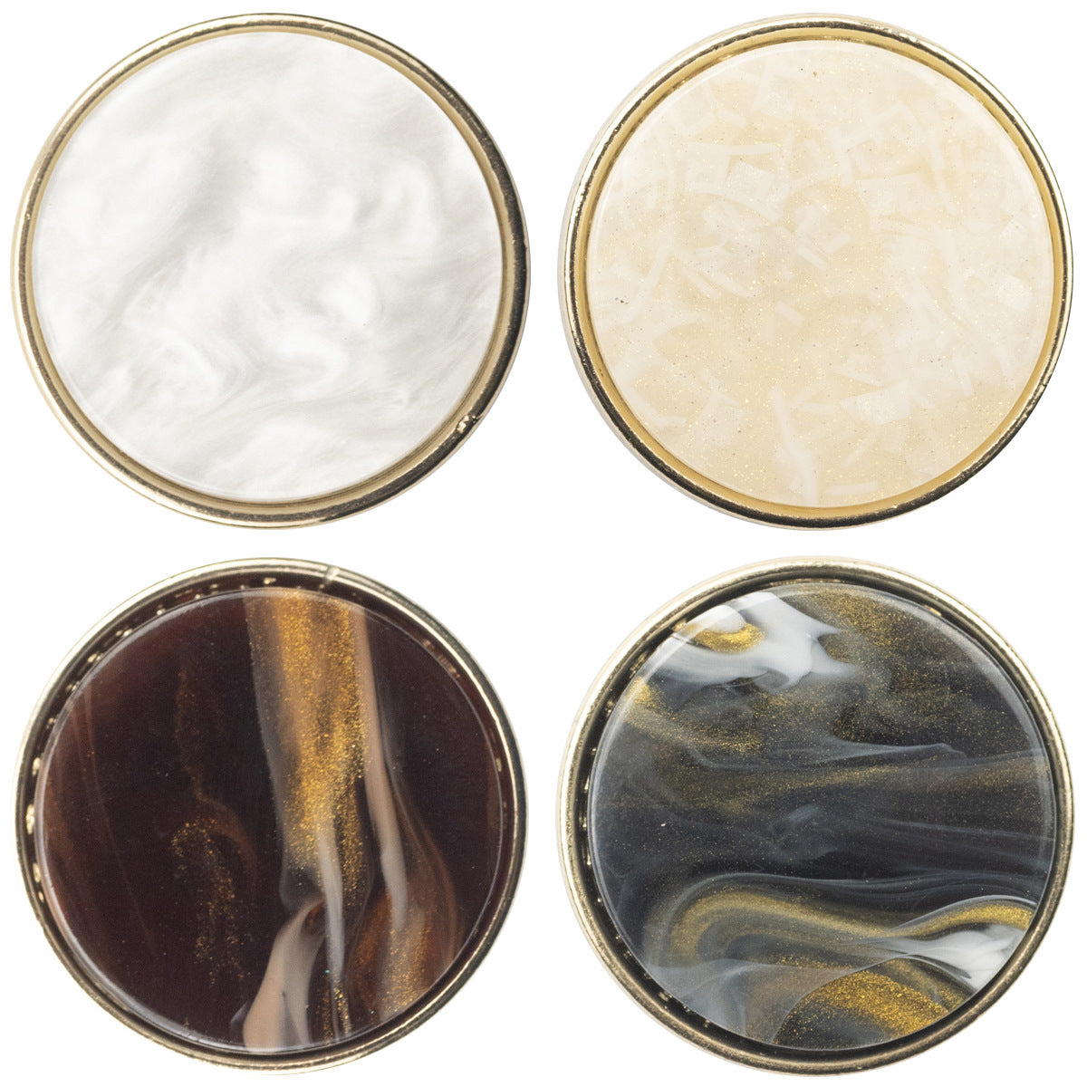 Vyrobené kombinací skla a kovu, tyto knoflíky nabízejí dokonalou rovnováhu mezi odolností a krásou. Skleněná část poskytuje hladký a lesklý povrch, zatímco kovová zadní část zajišťuje stabilitu a snadné připevnění.