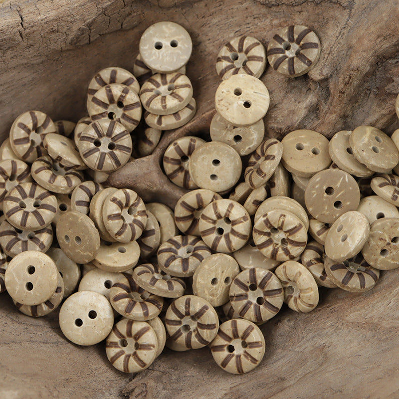 Přirozená textura a barva kokosové skořápky dávají těmto knoflíkům teplý a přírodní vzhled. Jsou lehké a pohodlné pro nošení dětmi.