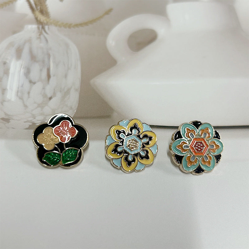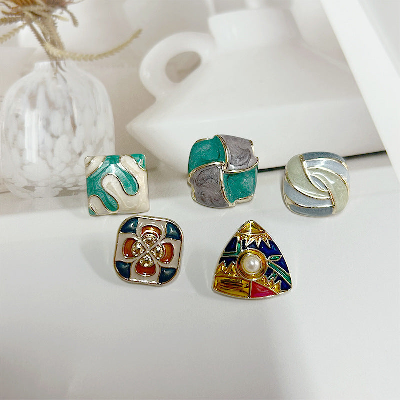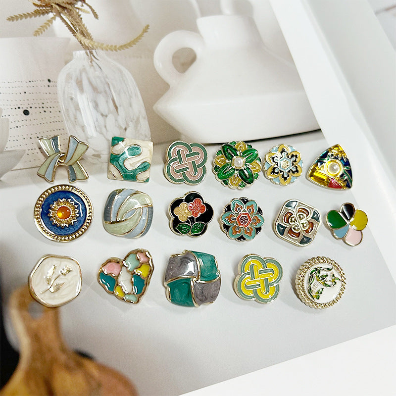 Tyto knoflíky mají vintage styl soudního dvora v kulatých, trojúhelníkových a čtvercových tvarech. Jsou vyrobeny technikou barevného smaltu inspirovanou olejomalbou. Unikátní smaltová práce jim dodává luxusní a umělecký vzhled. Barvy jsou živé a detaily precizní. Tyto knoflíky jsou ideální pro kabáty, přidávají nádech retro elegance a sofistikovanosti. Mohou proměnit obyčejný kabát v výrazný kousek, který vynikne svým jedinečným kouzlem. Vysoce kvalitní smalt zajišťuje odolnost a dlouhotrvající krásu, vhodné pro ty, kteří hledají dotek klasické a vytříbené módy.