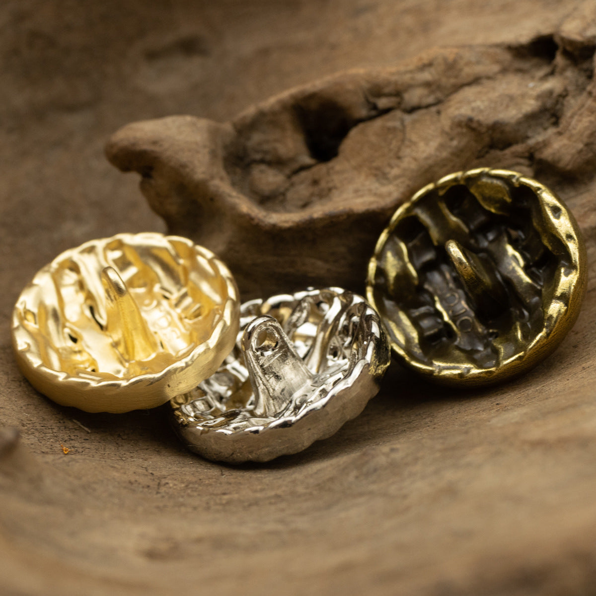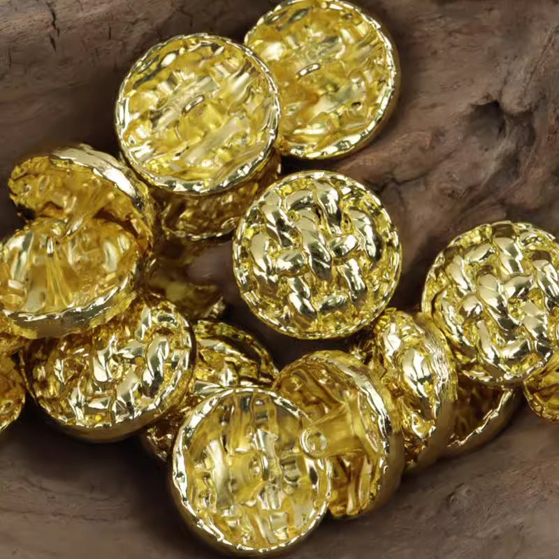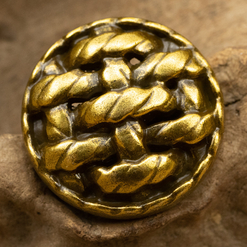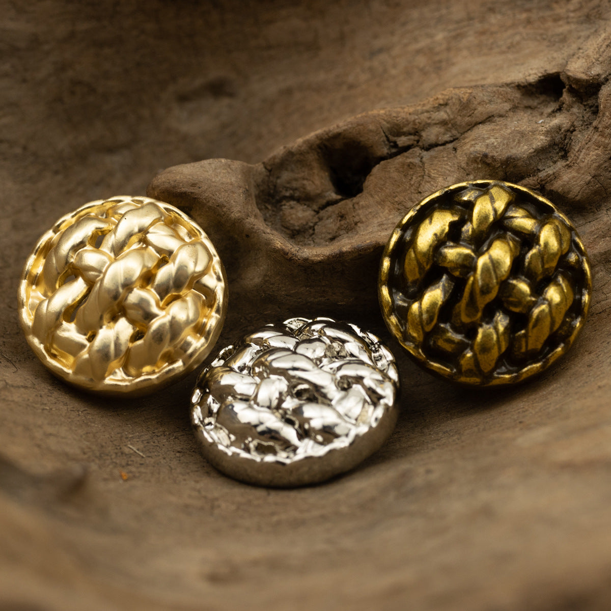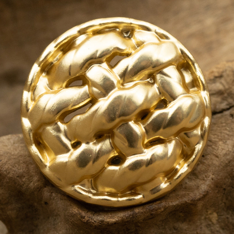 Pozvedněte svůj styl s tímto jedinečným vintage mlžně zlatým dutým silným krouceným pleteným kovovým knoflíkem s očkem. Tento knoflík je skutečným uměleckým dílem, spojujícím eleganci vintage designu s odolností kovu.