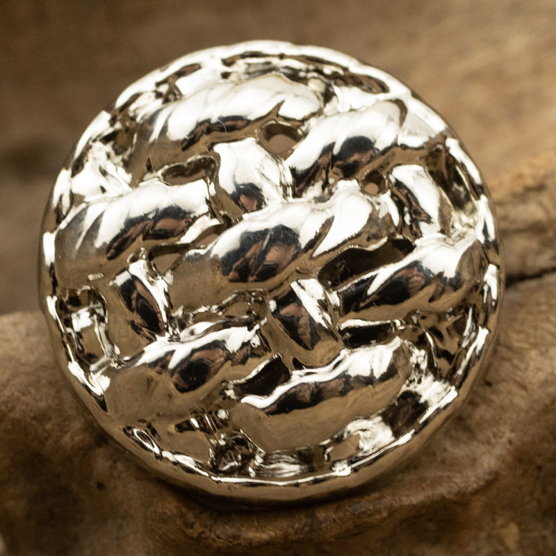 Mlžně zlatý povrch mu dodává jemný a sofistikovaný vzhled, zatímco dutý a silný kroucený pletený design přidává texturu a vizuální zajímavost. Očko usnadňuje připevnění a odejmutí, což poskytuje pohodlí pro vaše šicí a řemeslné projekty.