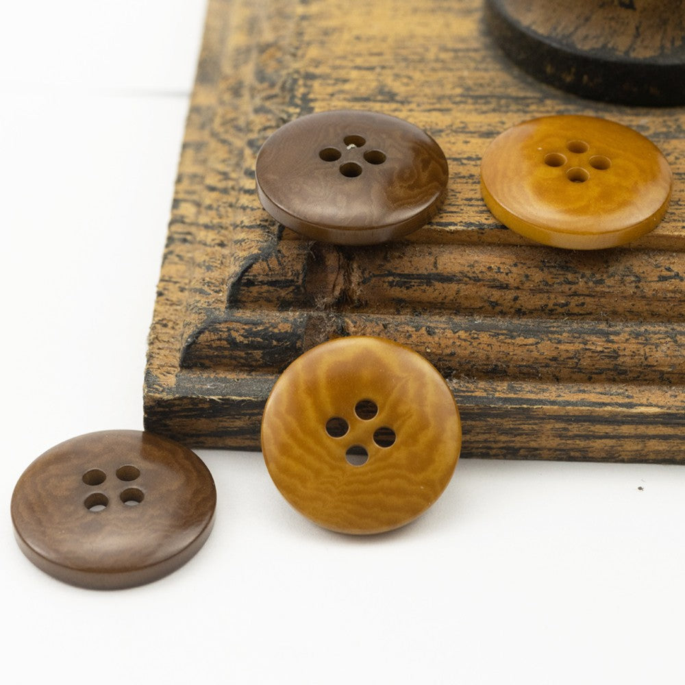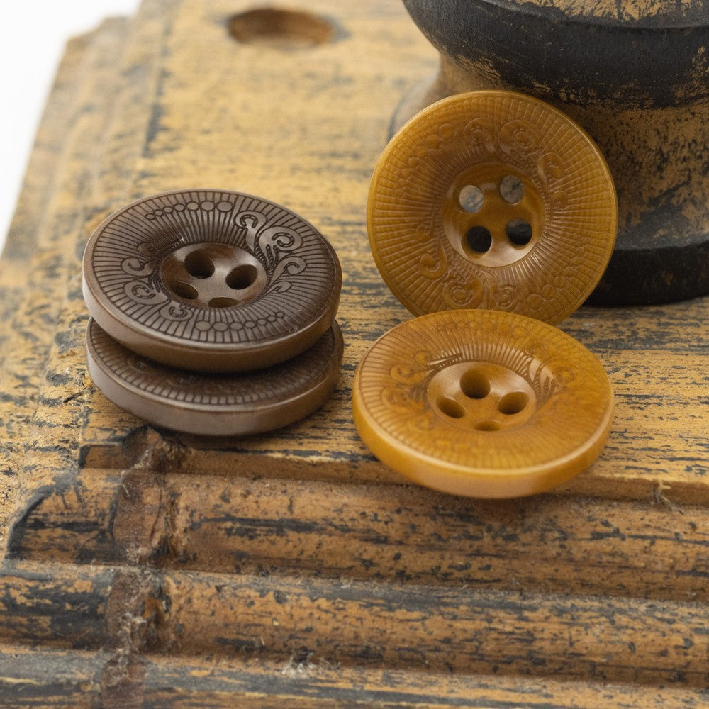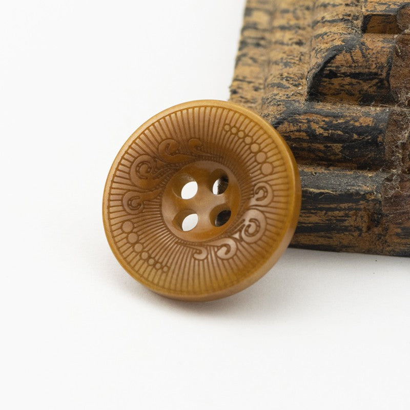 Přírodní knoflíky z palmové skořápky Tagut Nut se 4 dírkami - žluté a kávové barvy s laserovým gravírováním pro obleky, svetry, kardigany a větrovky, balení 15 kusů (3 velikosti)