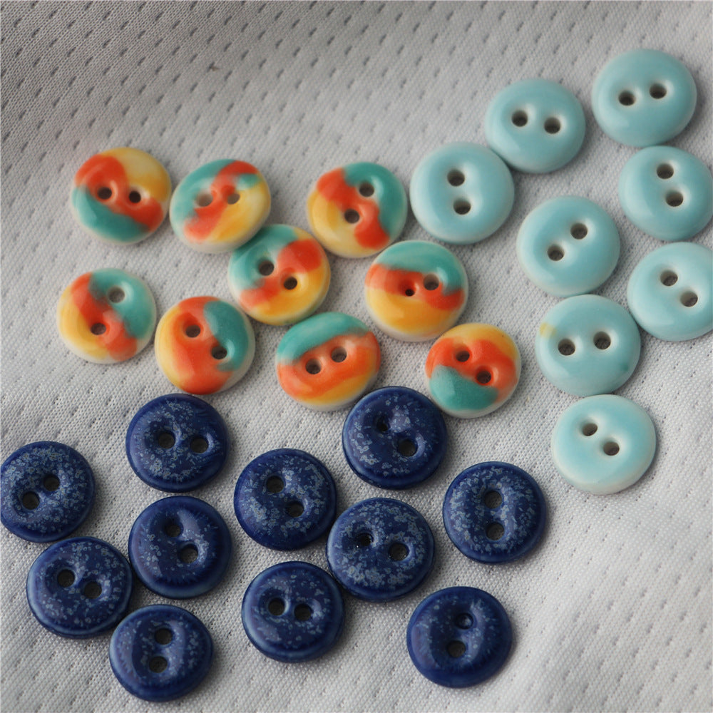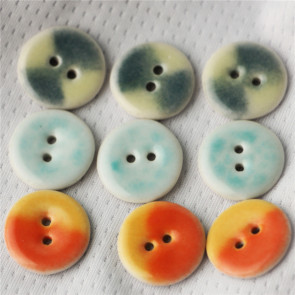 15mm blå orange runde dobbelthullede håndmalede keramiske syknapper 6 stk