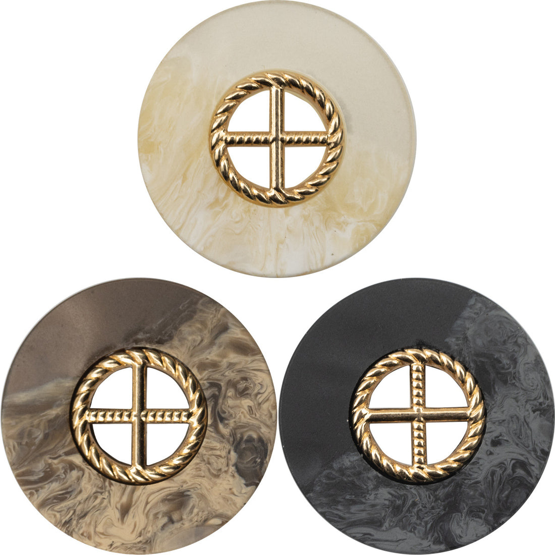 Runde vintage hæklede knapper i harpiks og metal, kombination, 10 stk.
