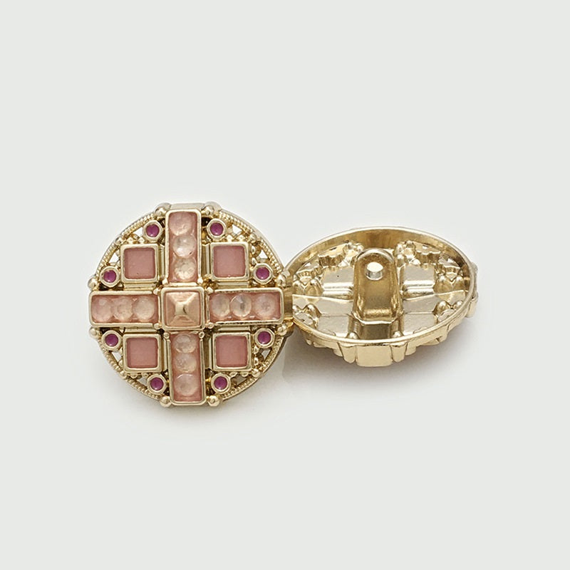 Runde lyserøde-guld metalknapper med skaft og korsformede rhinsten 10 stk