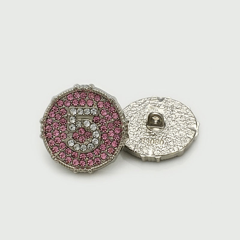 Nummer 5 Runde Sølv Metal Knapper med Pink Rhinsten 12stk