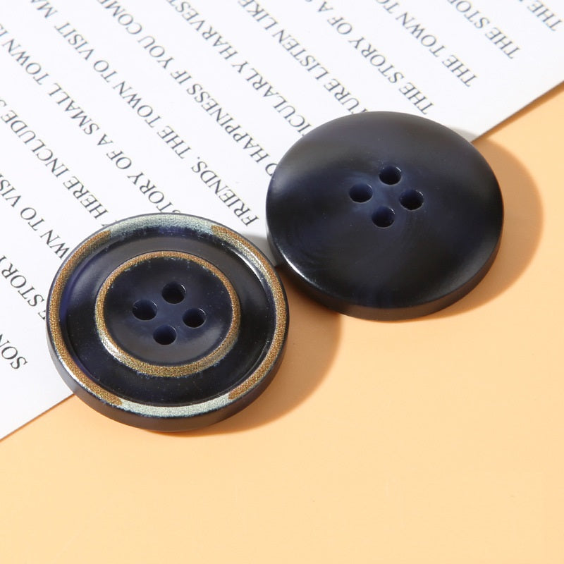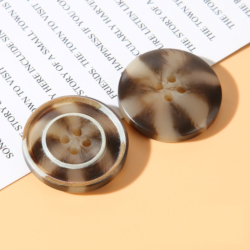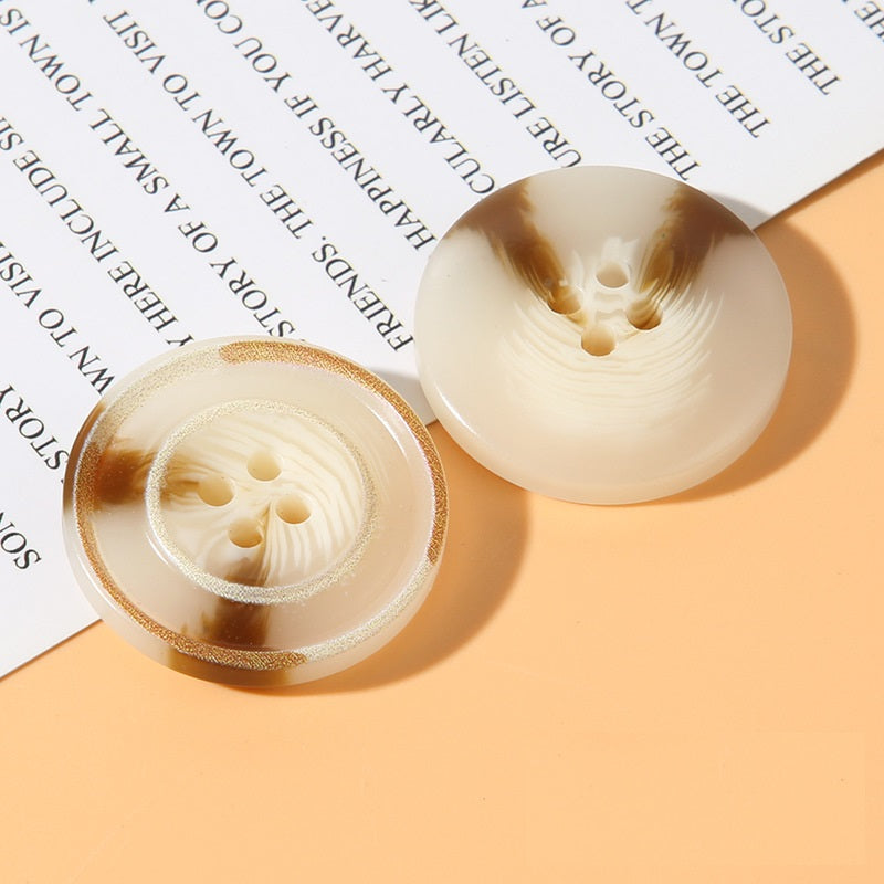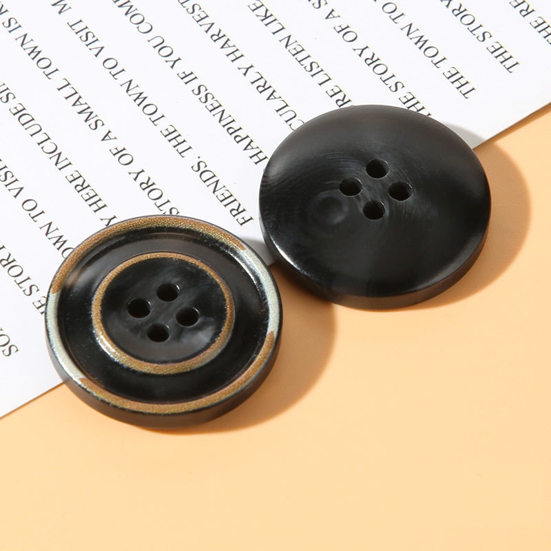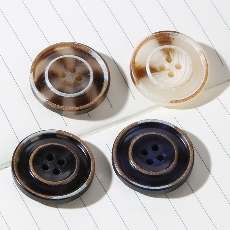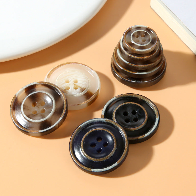 Disse harzknapper, i størrelserne 15/18/20/23/25 mm, har en klassisk rund form med fire huller og en unik patineret kantfinish. Tilgængelige i sort, mørkeblå, brun og beige, tilbyder de en alsidig farvepalet, der matcher forskellige stofnuancer og beklædningsstile.