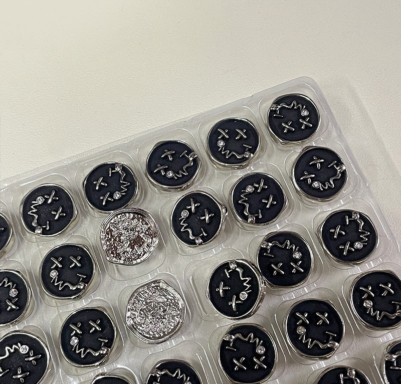 Disse 18/23 mm metalknapper er designet med et karakteristisk smiley-ansigt motiv. Den sorte farve giver dem et elegant og moderne udseende, der passer til en række forskellige modestile. Fremstillet af høj kvalitetslegering, er de holdbare og langtidsholdbare. De høje skaft gør dem praktiske til at fastgøre til forskellige stoftykkelser. Disse knapper kan bruges på beklædningsgenstande som jakker, skjorter og endda tasker eller accessories. De tilføjer et strejf af legesyghed og individualitet til ethvert stykke, hvilket giver bæreren mulighed for at udtrykke en sjov og unik stil. Uanset om det er til en afslappet dag ude eller en mere kreativ modedeklaration, er disse smiley-ansigtsknapper et fremragende valg.
