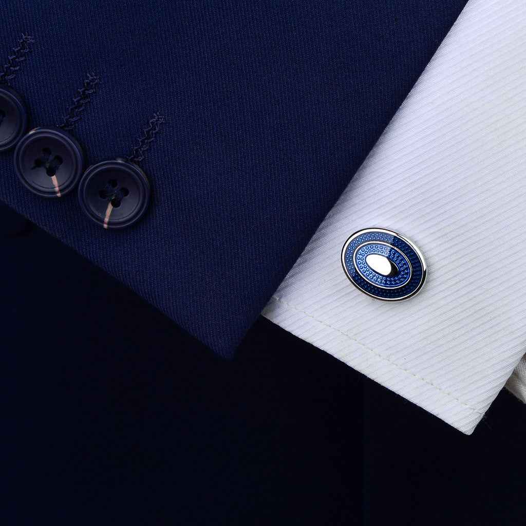 Gør et raffineret statement med disse elegante 19x15mm ovale manchetknapper, der har en fantastisk håndhældt blå harpiks med kunstnerisk drypdetalje. Perfekte til bryllupper, franske manchet skjorter og black-tie begivenheder, kombinerer disse unikke accessories håndværk med moderne stil.