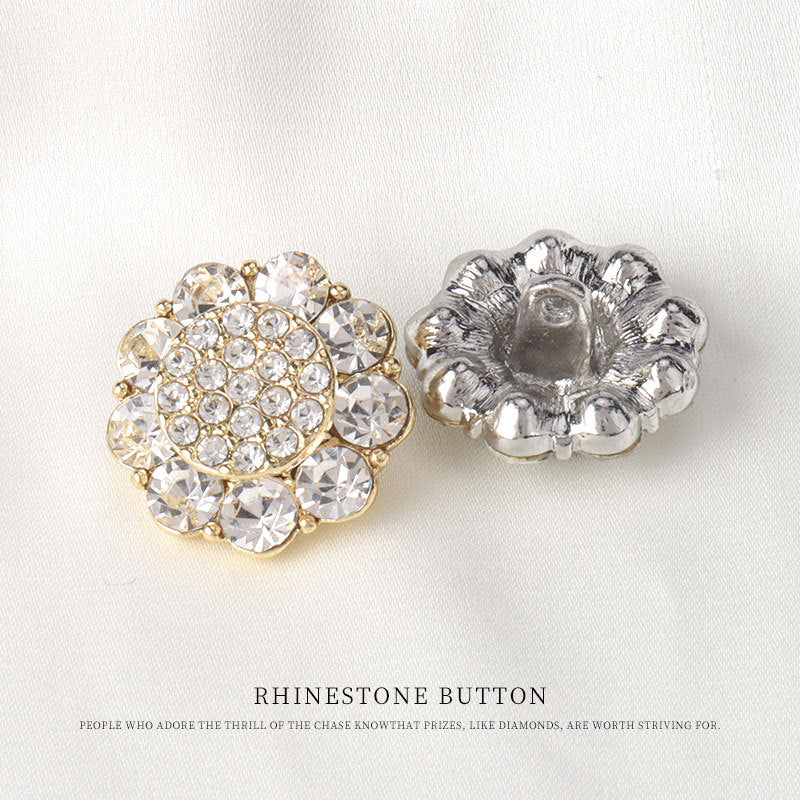 Disse 20 mm knapper er en blændende tilføjelse til ethvert tøjstykke. Fremstillet af metal af høj kvalitet, er de robuste og holdbare. Det blomsterformede design giver dem et elegant og charmerende udseende, der tilføjer et strejf af naturens skønhed. Tilgængelige i både guld- og sølvfarver, tilbyder de muligheder for at matche forskellige stilarter og stoffer. Det virkelige højdepunkt er de skinnende vandbaserede rhinsten. Disse rhinsten er omhyggeligt sat på knapperne og skaber en strålende glans, der fanger øjet fra alle vinkler. De er designet til håndsyning, hvilket gør dem nemme at fastgøre til forskellige beklædningsgenstande. Uanset om det er en luksuriøs aftenkjole, en stilfuld bluse eller en fin jakke, vil disse knapper forbedre det samlede æstetiske udtryk og forvandle det almindelige til det ekstraordinære med deres glamour og sofistikering.
