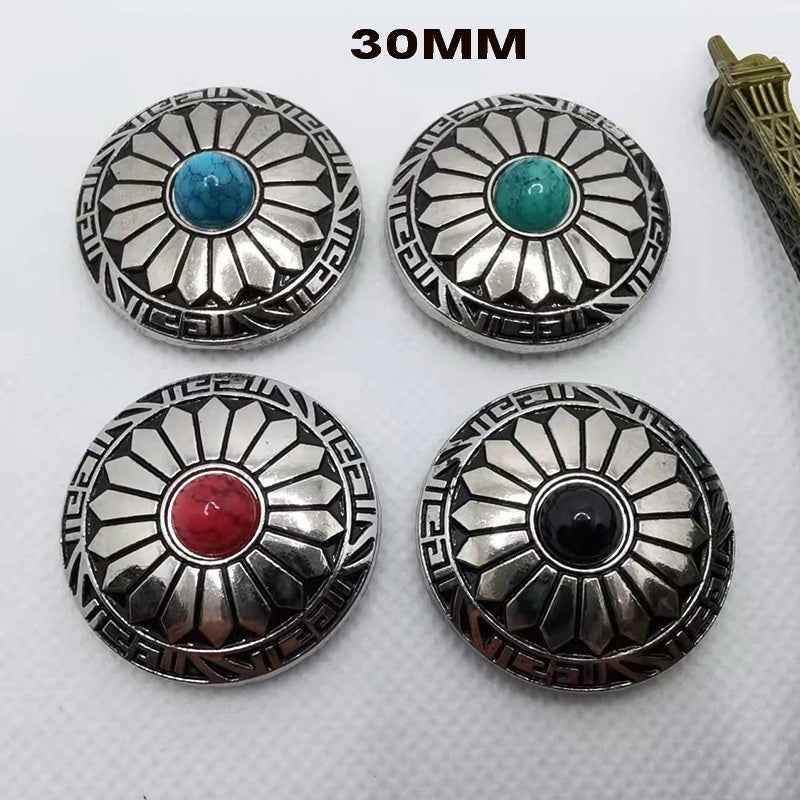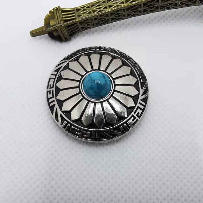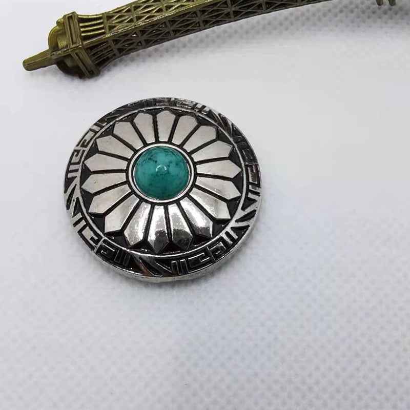 Den antikke sølvbelægning komplementerer det levende turkisindlæg og skaber en slående kontrast, der fremhæver enhver håndlavet pung, taske eller tilbehør. Dens 30 mm størrelse gør den ideel til traditionelle "财布" (japansk-stil punge), samtidig med at den forbliver alsidig til vestlige designs.